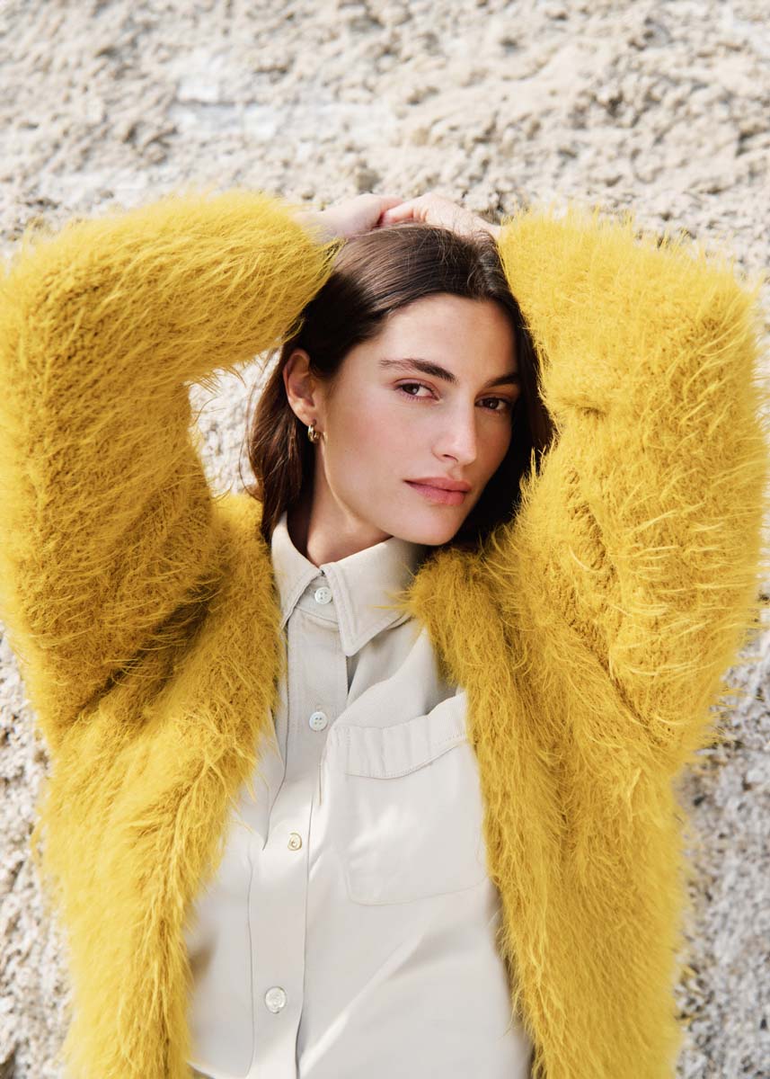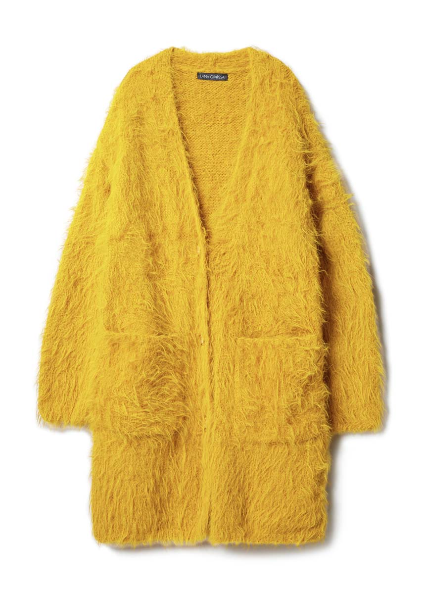 700 (750) г горчично- желтой (цв. 12) пряжи Basta (50% шерсти мерино, 50% полиамида, 100 м/50 г) фир- мы Lana Grossa; прямые спицы № 6; 3 пу- говицы цвета карри диаметром 28 мм