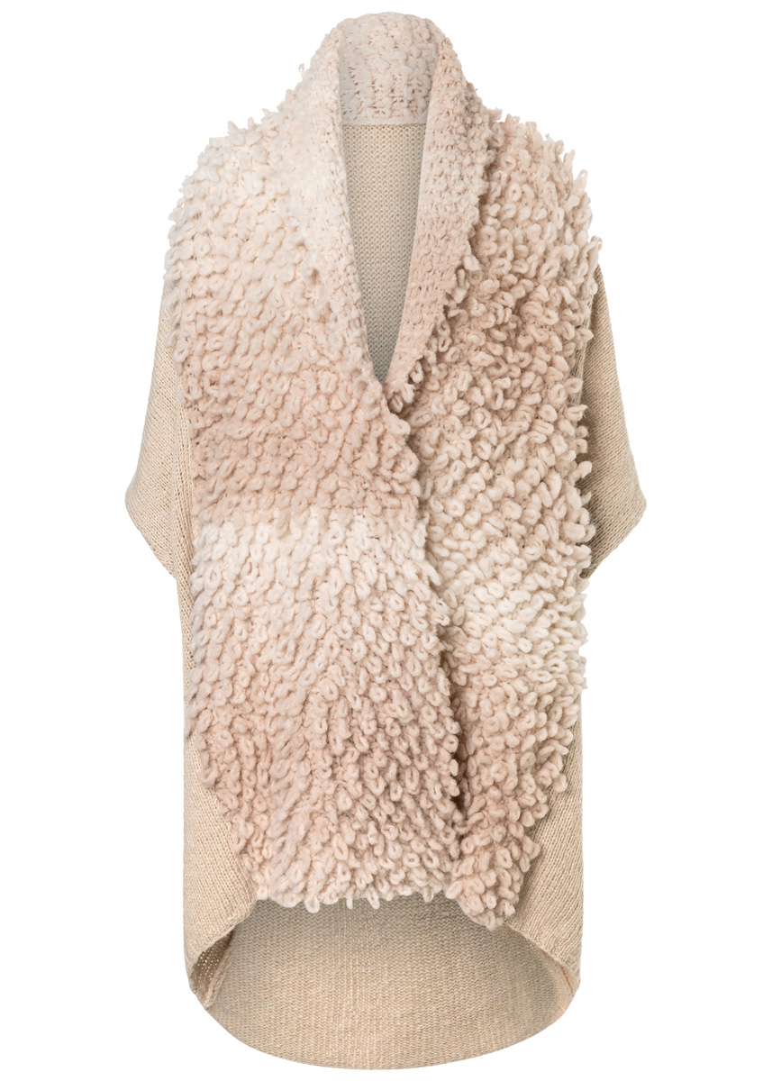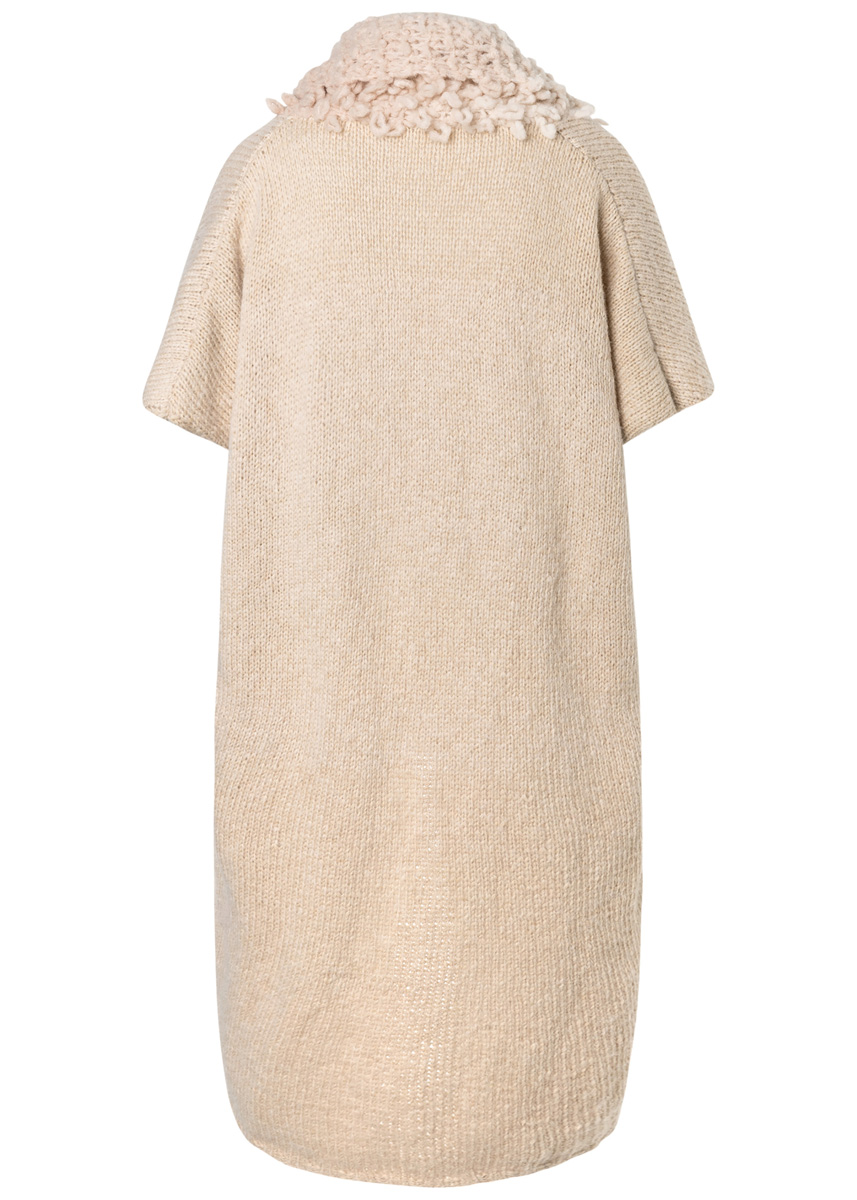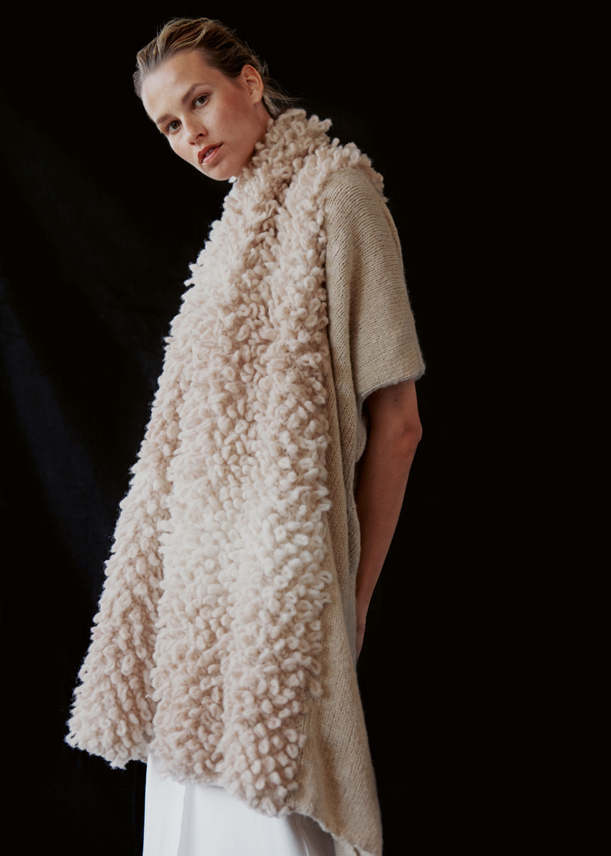 400 (450–500) г свет- ло-бежевой (цв. 47) пряжи Brigitte No. 2 (47% альпака бэби, 45% хлопка, 8% шерсти мерино, 140 м/50 г) и 300 (350–400) г бе- жевой (цв. 1) пряжи Lala Berlin Cloudy (93% шерсти мерино экстрафайн, 7% нейлона, 100 м/50 г) фирмы Lana Grossa; прямые спицы № 5, № 6 и № 8.