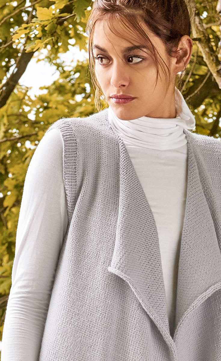 450 (500) 550 г нежно-лиловой (цв. 19) пряжи Cool Wool Alpaca (70% овечьей шерсти, 30% шерсти альпака, 140 м/50 г) фирмы Lana Grossa; прямые спицы № 4 и № 4,5; круговые спицы № 4 длиной 60 см