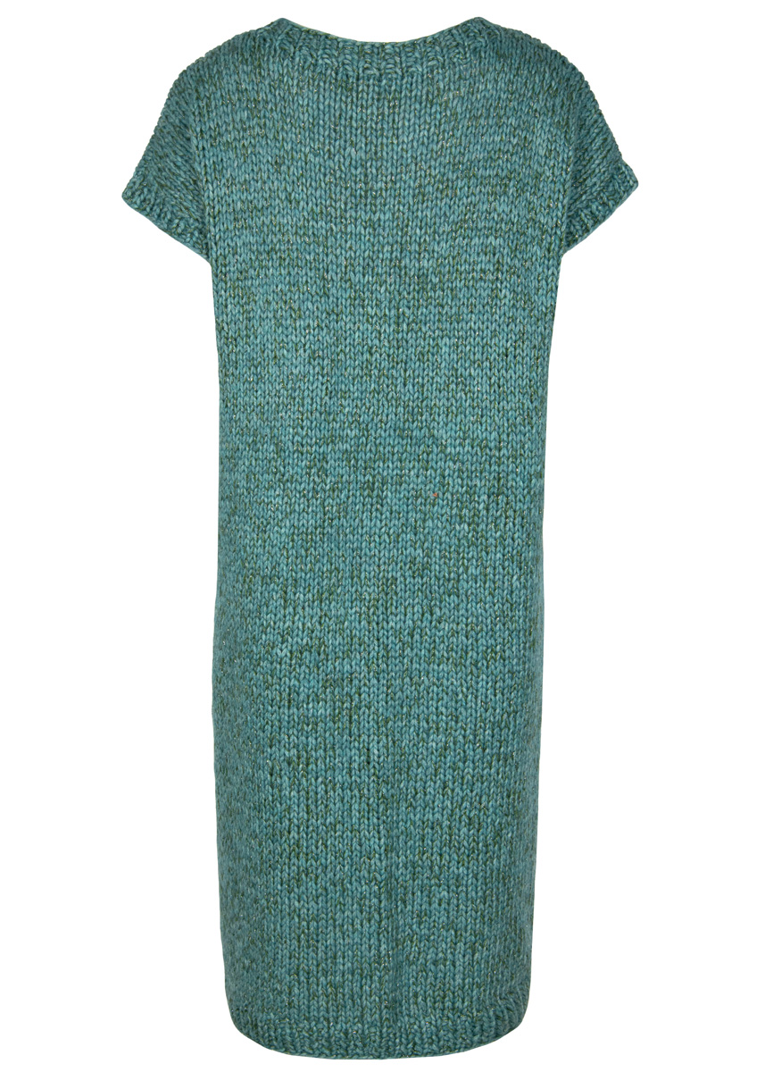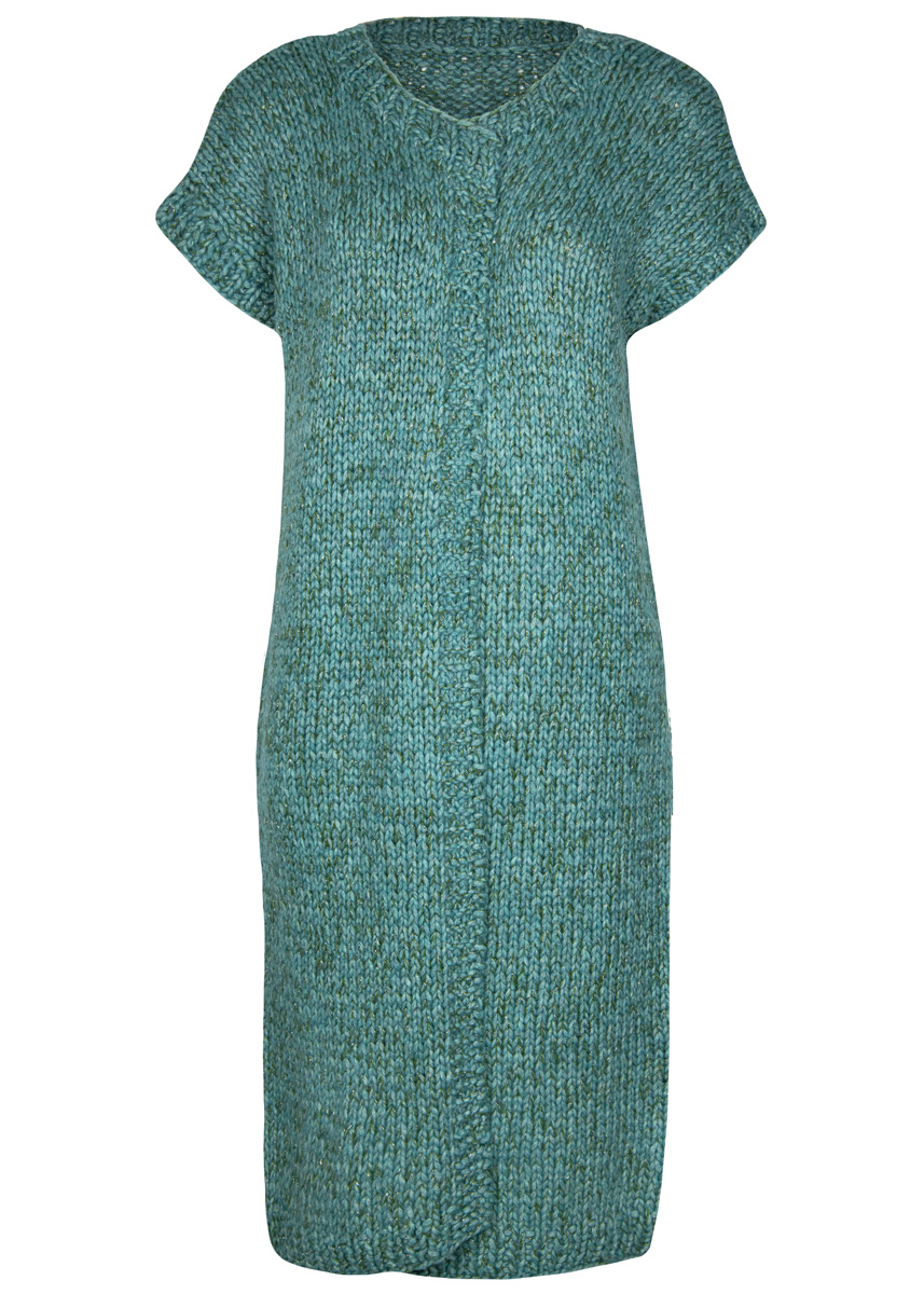500 (550) г петрольной (цв. 18) пряжи Lala Berlin Lovely Cotton (75% овечьей шерсти (мериносовой шерсти суперфайн), 25% хлопка, 90 м/50 г) и 100 (125) г черной/серебристой (цв. 18) пряжи Brillino (83% вискозы, 17% металлизиро- ванного волокна, 200 м/25 г) фирмы Lana Grossa; круговые спицы № 8 и № 10 длиной 120 см, круговые спицы № 8 длиной 60 см