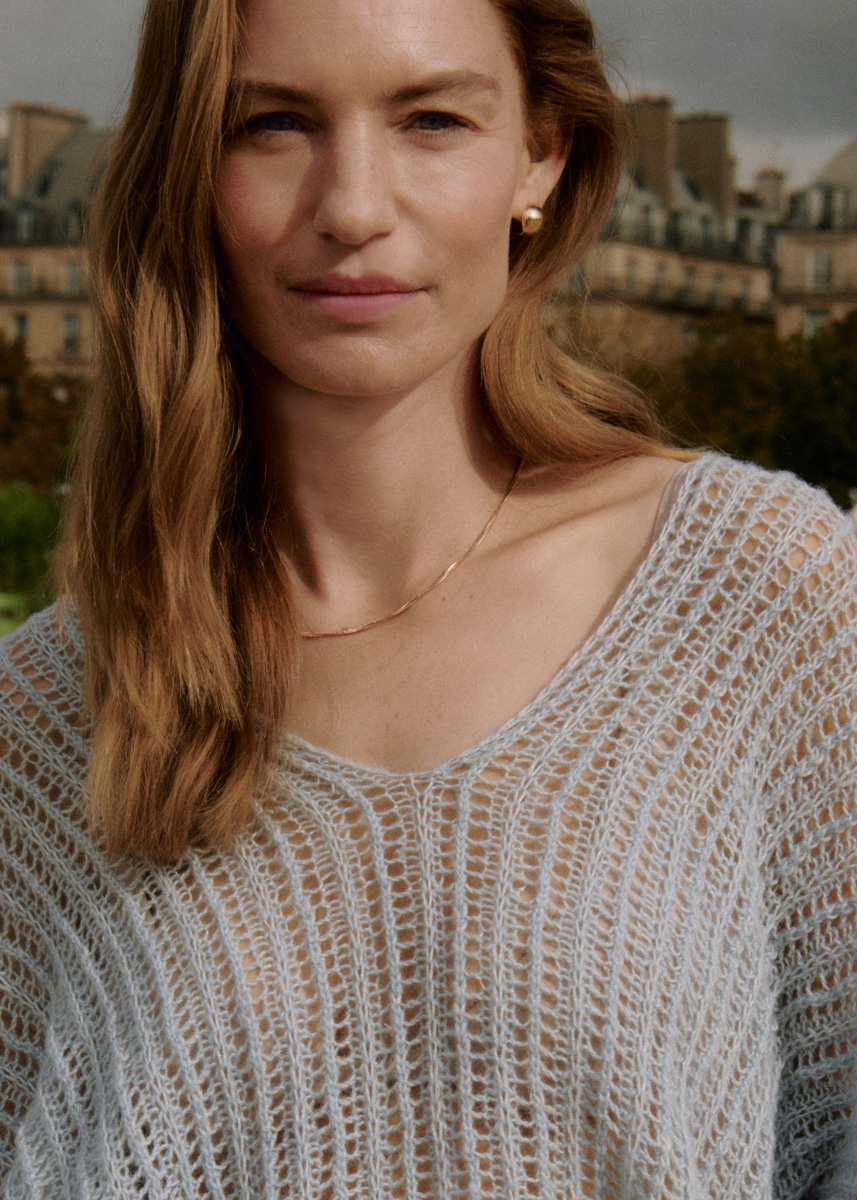Lana Grossa-Qualität „Puno Luce“ (30 % альпака (беби), 30 % шерсть (меринос), 20 % полиамид, 20 % хлопок, длина нити = ок 250 m/50 g): ок 250 (250–300–300) г серебристо серый (цв 6); сп. № 3,5 и 4.