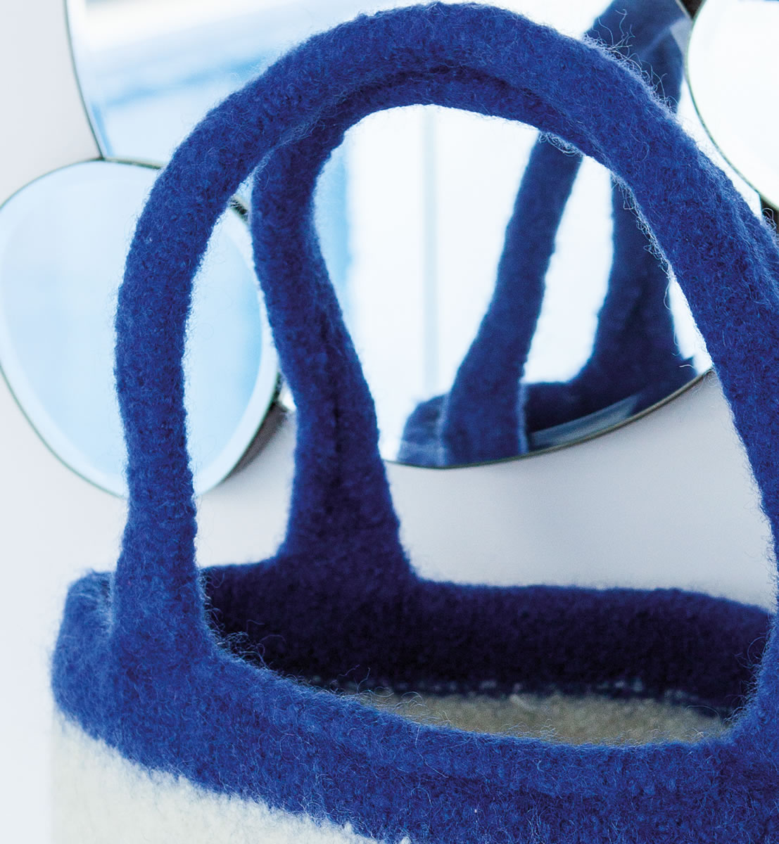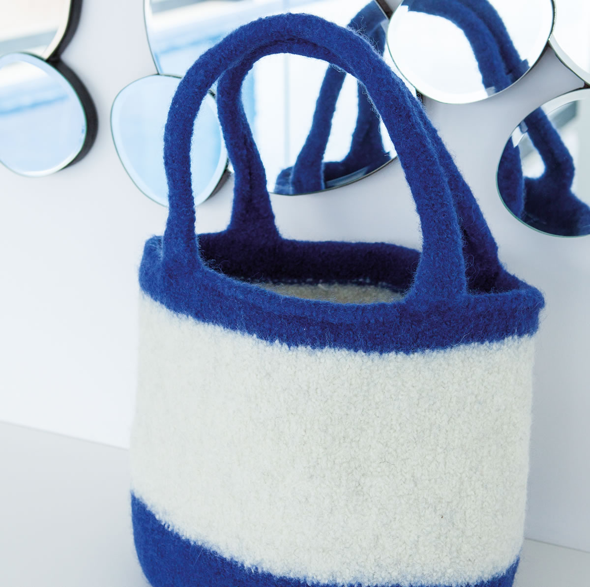 300 г синей (цвет 26) и 250 г белой (цвет 1) пряжи Feltro фирмы Lana Grossa (100% шерсти, уменьшается в объеме при стирке на 30–40%, 50 м/50 г); круговые спицы № 8 длиной 60 см.