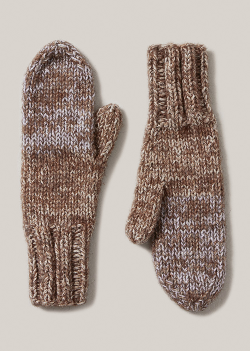 по 50 г бежевой (цв. 3) и светло-си- ней (цв. 10) пряжи Cara (57% альпака бэби, 33% хлоп- ка, 10% шерсти мерино, 120 м/50 г) и 50 г темно-ко- ричневой меланжевой (цв. 8) пряжи Natural Alpaca Pelo (63% хлопка, 31% альпака бэби, 6% шерсти ме- рино, 125 м/50 г) фирмы Lana Grossa; чулочные спицы № 6, игла с тупым концом.