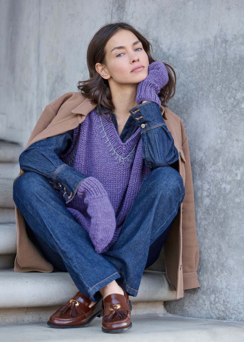 Lana Grossa-Qualität „Winter Softness“ (62 % шерсть (меринос), 38 % хлопок (био), длина нитки = ca 70 m/50 g): 100 г фиолетовый (цв 8); чул. сп. № 5 и 6.