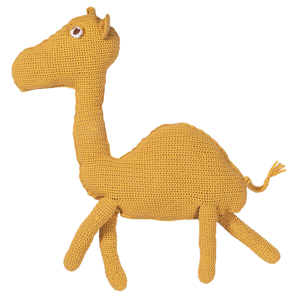 300 г желтой (цв. 17) и остатки белой (цв. 1) и серо-коричневой (цв. 4) пряжи Riserva (70% биохлопка, 30% рециклированного полиамида, 125 м/50 г) фирмы Lana Grossa; крючок № 3,5, № 5 и № 7; 250 г ватки для набивки