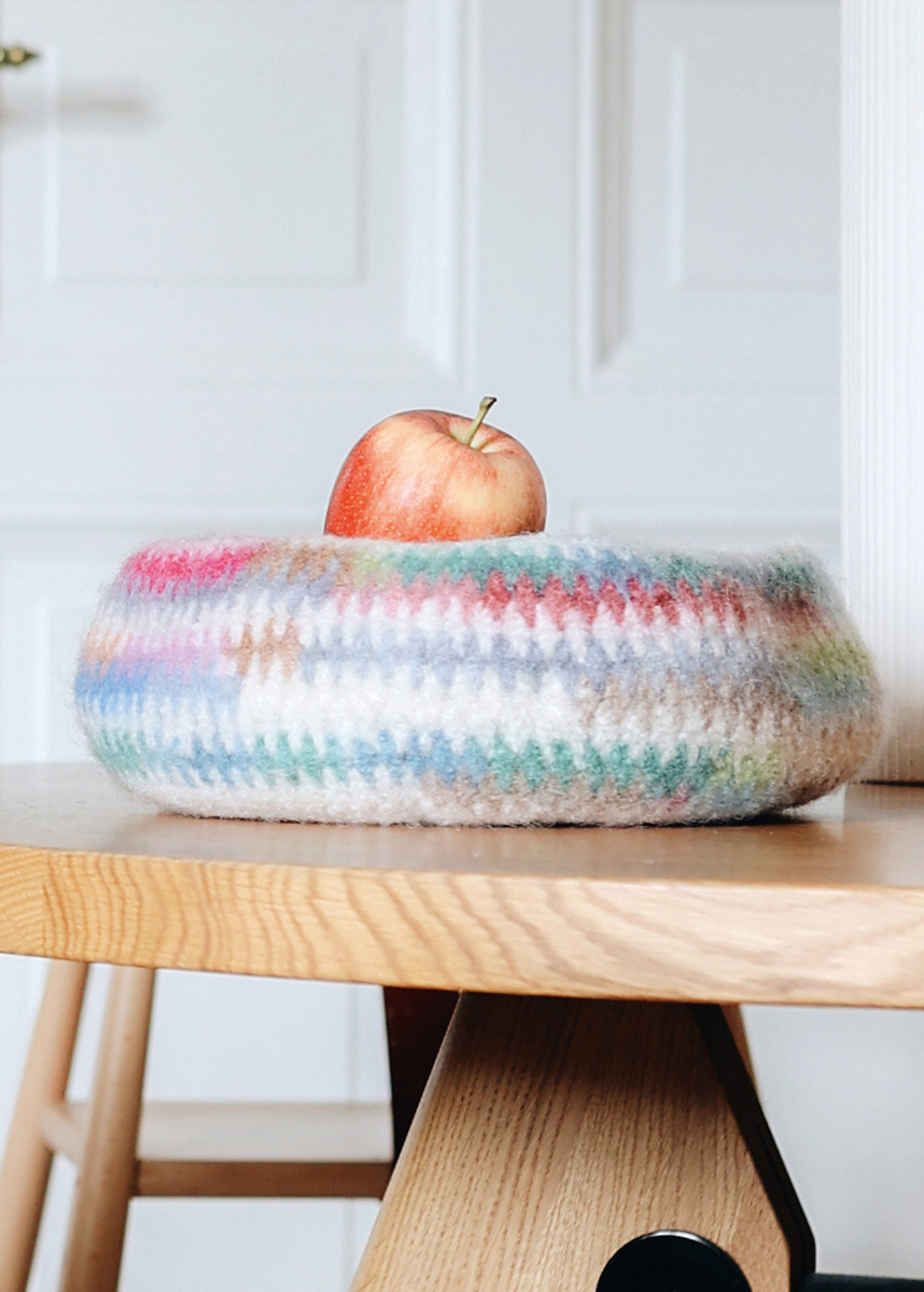 Размер после валяния: длина окружно- сти ок. 80 см, по верхнему краю ок. 72 см, диаметр ок. 21 см, высота ок. 10 см