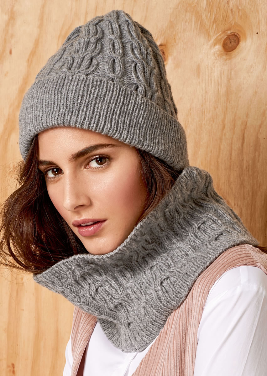 50 г светло-серой (цвет 15) пряжи Cashmere 16 Fine фирмы Lana Grossa (80 % шерсти мерино экстрафайн, 10 % кашемира, 10 % полиамида, 320 м/50 г). Круговые спицы № 3 и 3,5, 2 спицы для кос