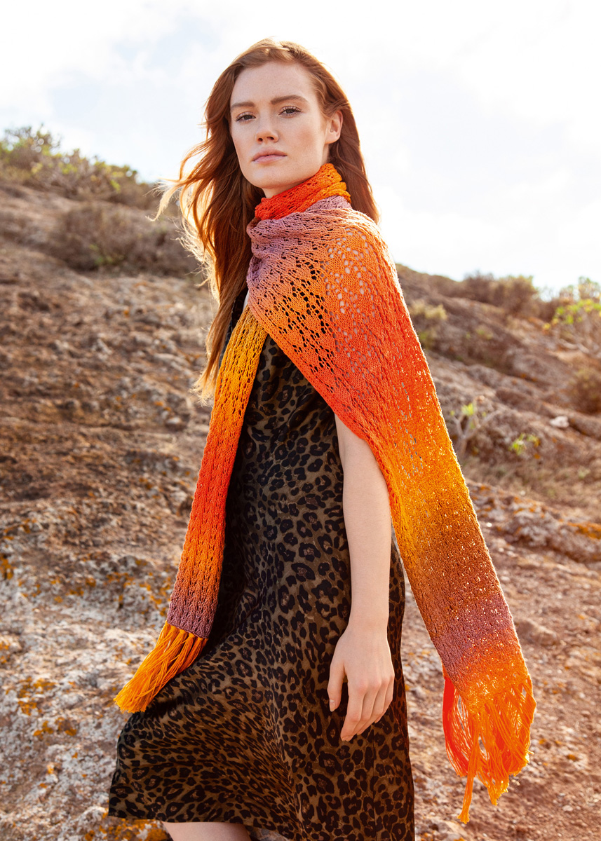 Lana Grossa Gomitolo Aloha (50 % хлопок, 50 % вискоза, длина нитки 250 m/100 g), 400 г жёлто-оранжевый/оранжево-красный/золотисто-коричневый/розовое дерево/ореховый цвет (цв 306); сп. № 4,5, 1 крючок № 4 для бахромы.