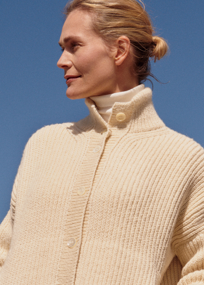 900 (950–1000) г белой суровой (цв. 14) пряжи Alta Moda Alpaca (90% шерсти (ягненка) альпака, 5% овечьей (мериносовой) шерсти, 5% полиа- мида, 140 м/50 г) фирмы Lana Grossa; прямые спицы № 3, № 4 и № 5, круговые спицы № 3 длиной 40 см, кру- говые спицы № 3 длиной 80 см, крючок № 3,5; 8 белых пуговиц диаметром 20 мм