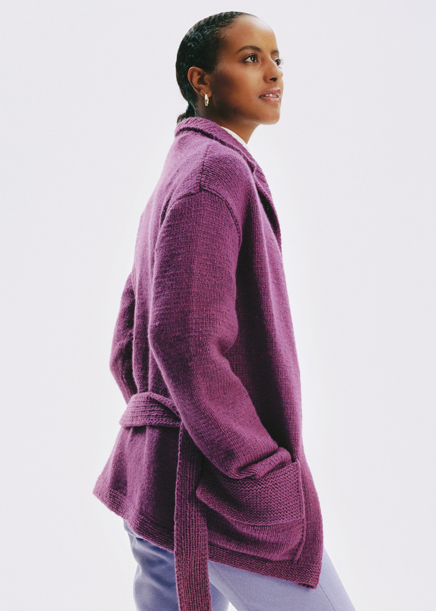 850 (900–950) г цвета фуксии (цв. 60) пряжи Alta Moda Cashmere 16 (78% шерсти мерино 16 микрон, 12% кашемира, 10% полиамида, 110 м/50 г) фирмы Lana Grossa; прямые спицы № 5 и № 5,5, круговые спицы № 5 длиной 40 см и крючок № 4,5; 5 темно-корич- невых пуговиц диаметром 26 мм