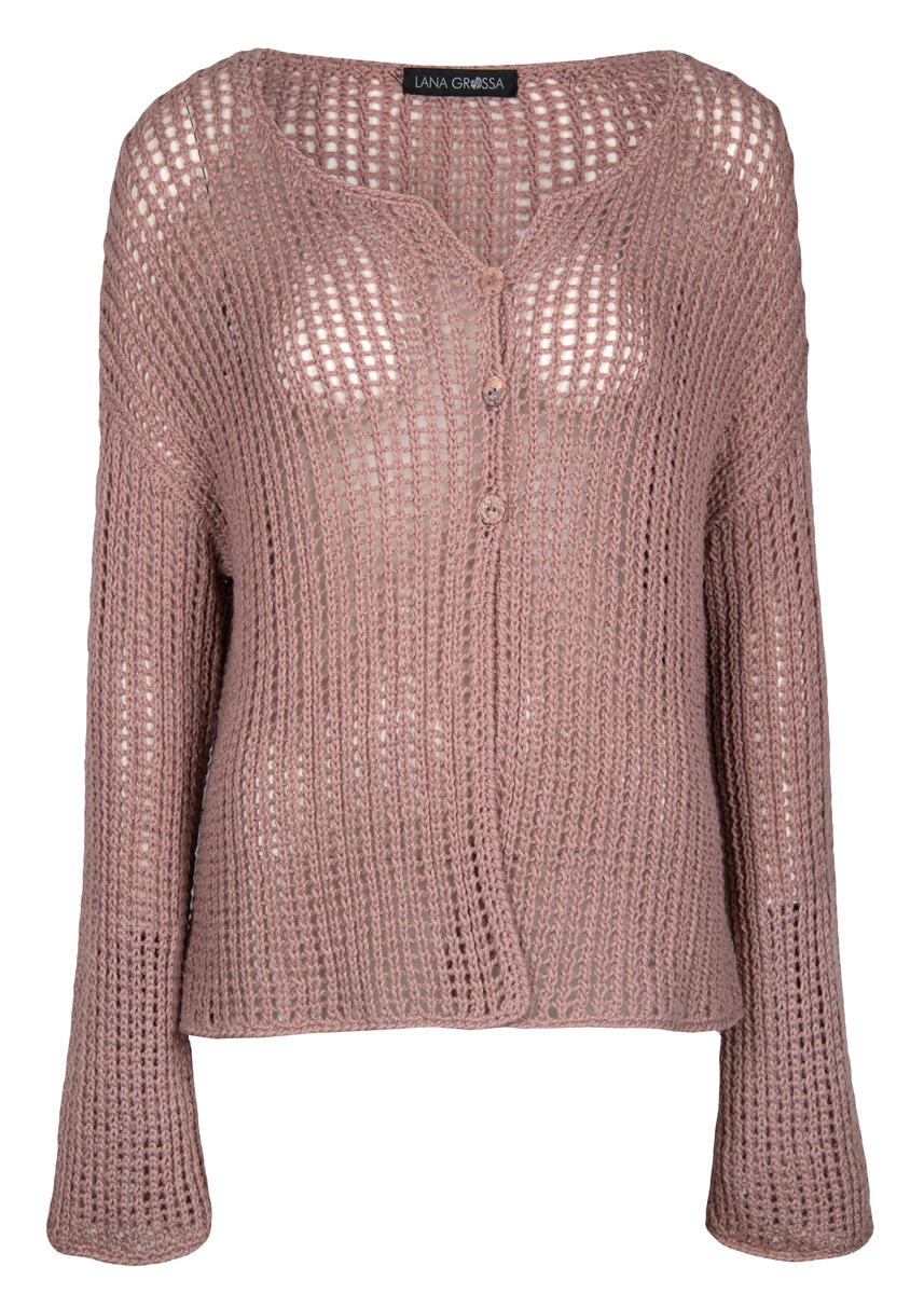 400 (450–500–550) г цвета увядшей розовой розы (цв. 7) пряжи Alta Moda Cotolana (45% мериносовой шерсти, 45% хлопка пима, 10% полиамида, 150 м/50 г) фирмы Lana Grossa; прямые спицы № 5, крючок № 4, 3 пуговицы диаметром 18 мм