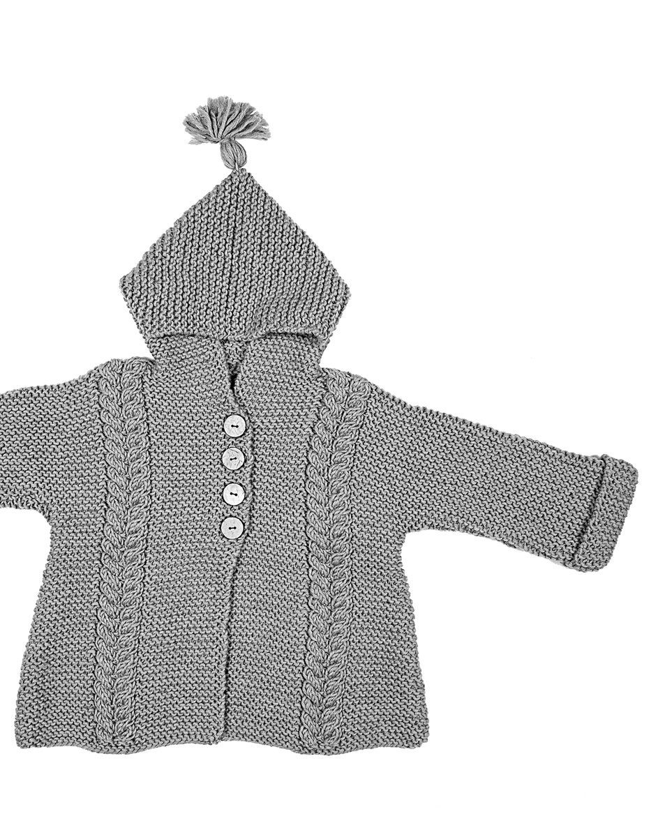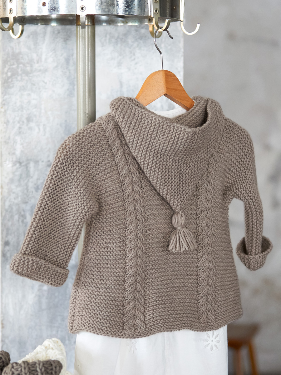 450 (450–500) г серо-бежевой меланжевой (цв. 252) пряжи Bingo Mélange (100% шерсти, 80 м/50 г) фирмы Lana Grossa; прямые спицы № 6, круговые спицы № 6 длиной 40 см, вспомогательная спица, 4 бело-бежевые пуговицы диаметром 22 мм