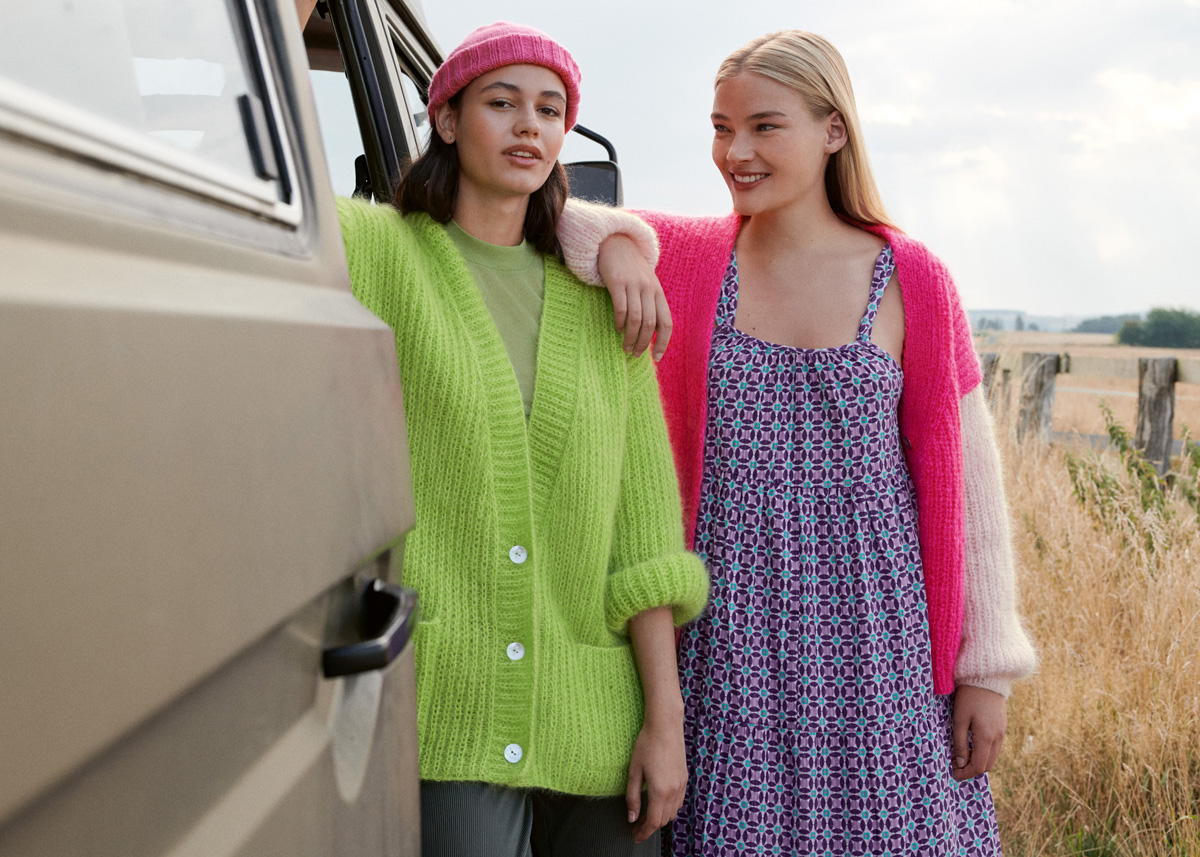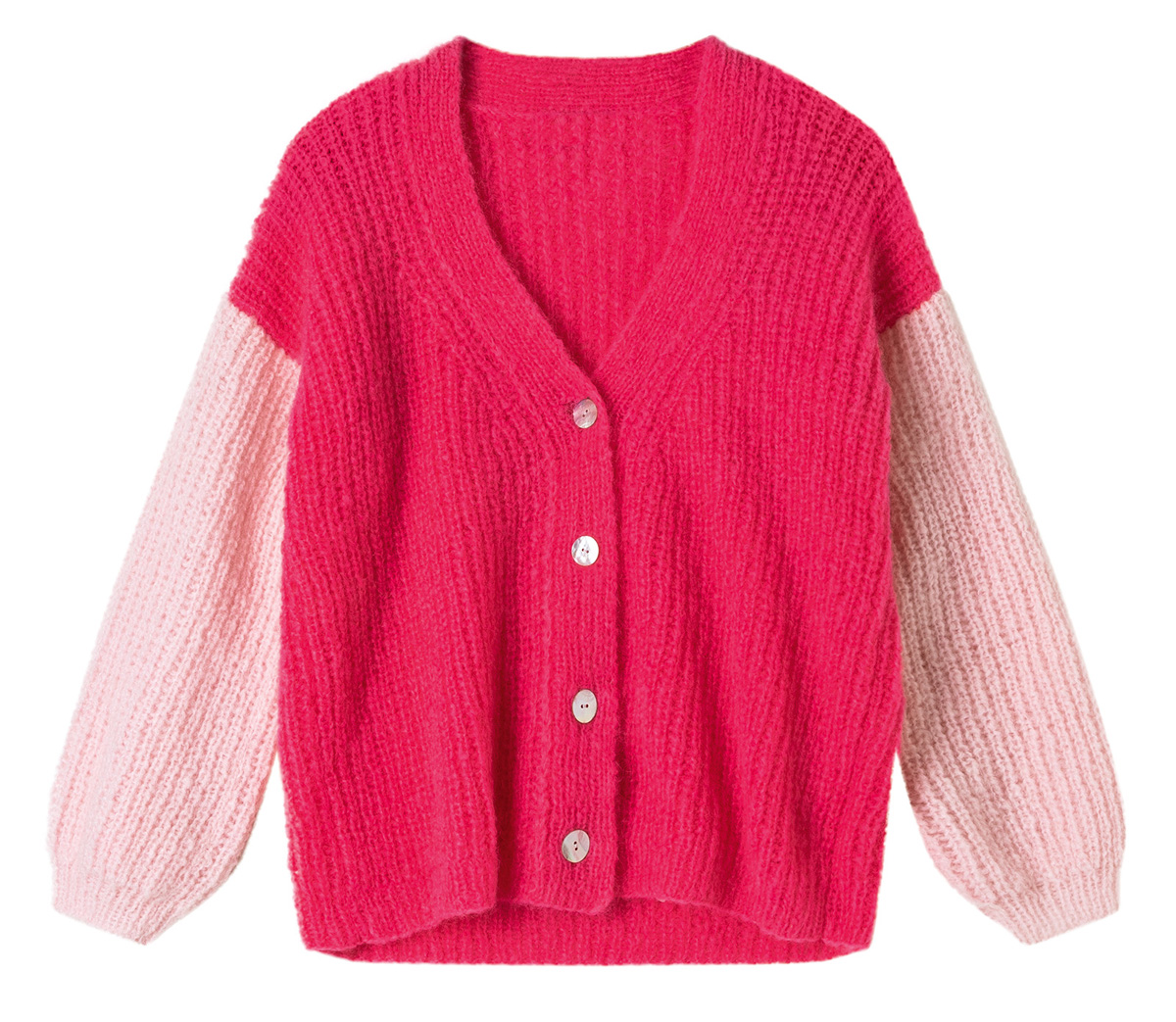 300 (350–350) г ярко-розовой (цв. 13) и 150 (200–200) г нежно-розовой (цв. 14) пряжи Lala Berlin Brushy (42% мохера суперкид, 38% шерсти мерино, 20% полиамида, 135 м/50 г) фирмы Lana Grossa; прямые спицы № 4,5 и № 5, крючок № 4; 4 пуговицы диаметром 23 мм.