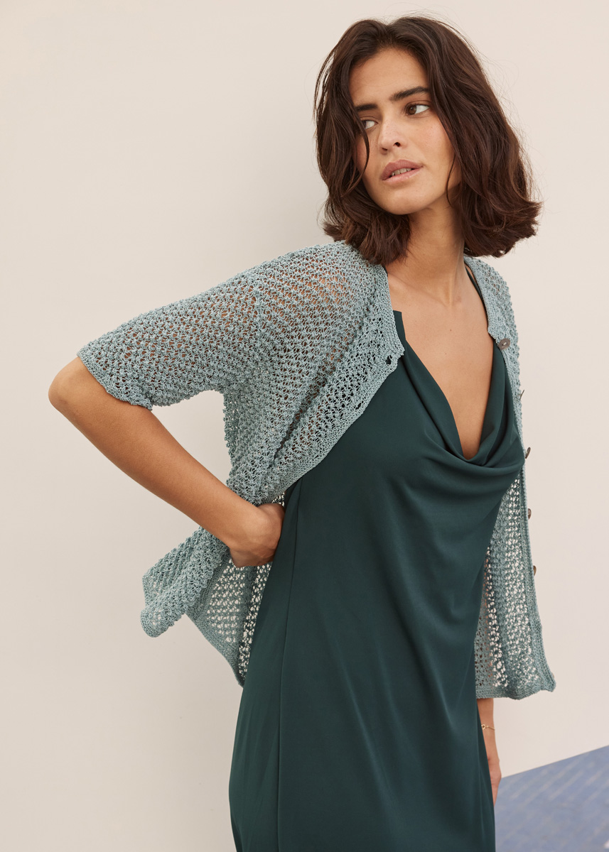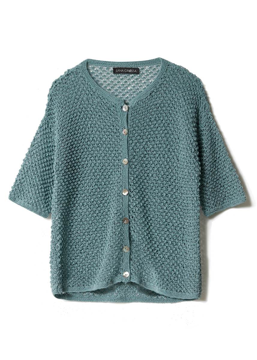 350 (400–450) г цвета зеленого дамаста (цв. 45) пряжи Capri (55% хлопка, 30% полиамида, 15% шелка, 150 м/50 г) фирмы Lana Grossa; прямые спицы № 3 и круговые спицы № 3 длиной 60 см; 7 пуговиц диаметром 14 мм