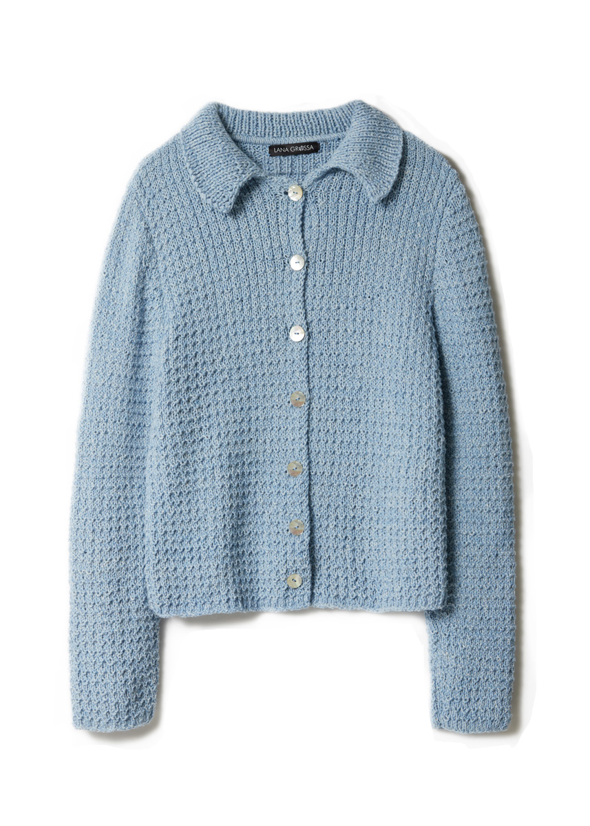 650 (700–750) г свет- ло-синей (цв. 10) пряжи Cara (57% альпа- ка бэби, 33% хлопка, 10% шерсти мерино, 120 м/50 г) фирмы Lana Grossa; прямые спицы № 4, круговые спицы № 3, № 3,5 и № 4, каждые длиной 40 см; 7 пуговиц ди- аметром 20 мм.