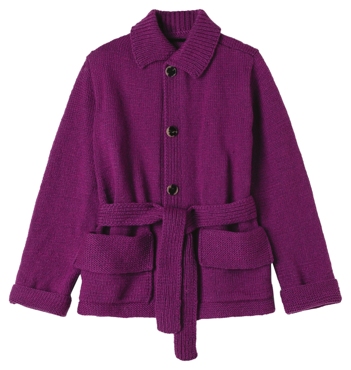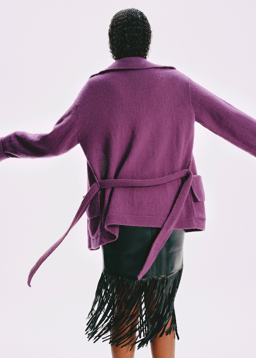600 (625–650) г цвета фиалки (цв. 8) пряжи Cashmere Verde (100% кашемира, 90 м/25 г) фир- мы Lana Grossa; прямые спицы № 3,5 и № 4, круговые спицы № 3,5 длиной 40 см и крючок № 3,5; 5 темно-ко- ричневых пуговиц диаметром 26 мм