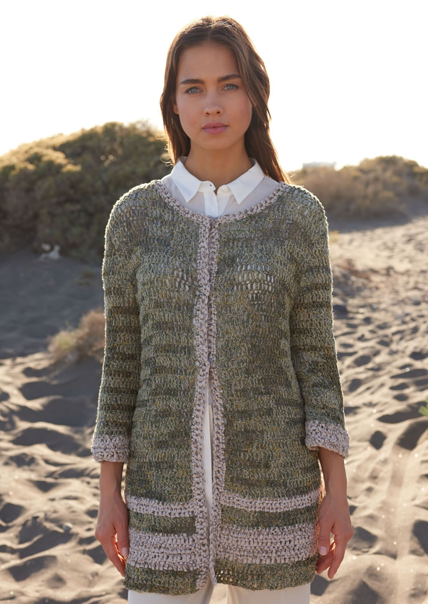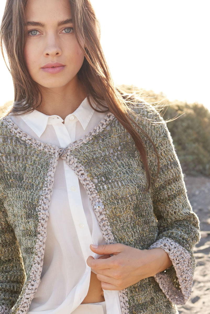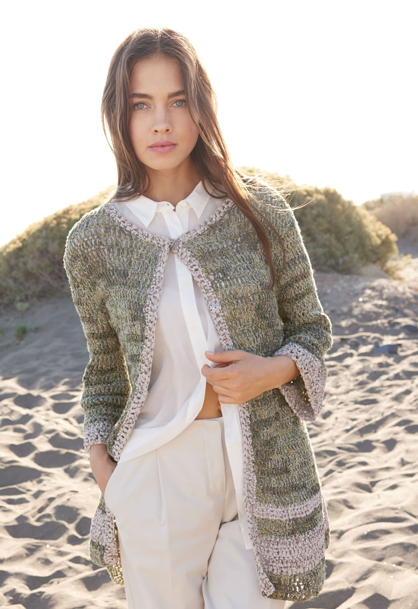 350 (400) 450 г белой натуральной/горчичной/серо-зеленой (цв. 4) пряжи Coco (67% хлопка, 33% нейлона, 115 м/50 г) и 100 (100) 150 г цвета шелка-сырца (цв. 7) пряжи Alcanto (70% полиэстера, 30% полиамида, 125 м/50 г) фирмы Lana Grossa; крючок № 6; 3 пришиваемые кнопки диаметром 20 мм, цвет светло-серый