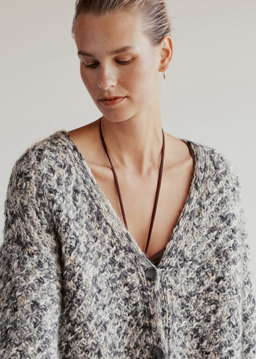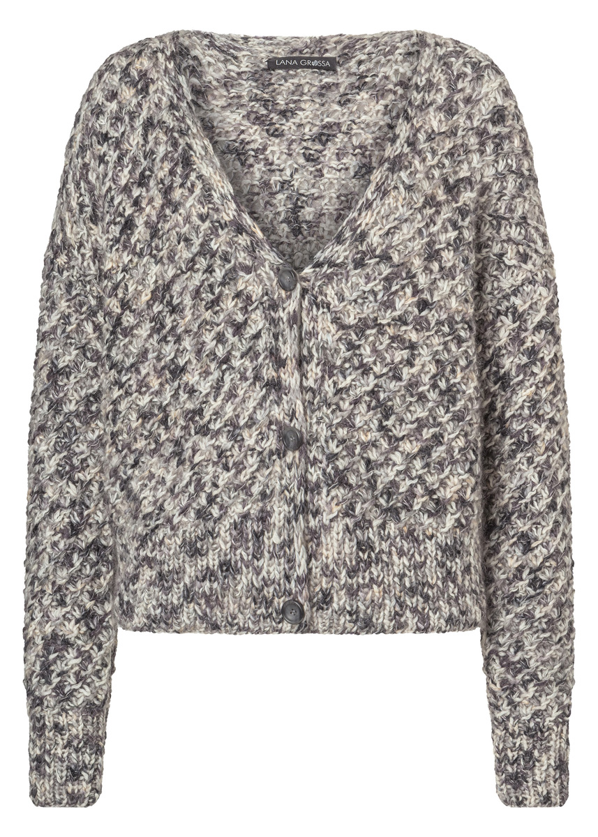 550 (600–650) г белой/ светло-/темно-серой (цв. 7) пряжи Colortwist (74% шерсти мерино, 20% хлопка, 6% полиамида, 90 м/50 г) и 100 (125–150) г серо-бежевой (цв. 184) пряжи Silkhair (70% мохера суперкид, 30% шелка, 210 м/25 г) фирмы Lana Grossa; прямые спицы № 6 и № 7; 3 серые пуговицы диаметром 20 мм.