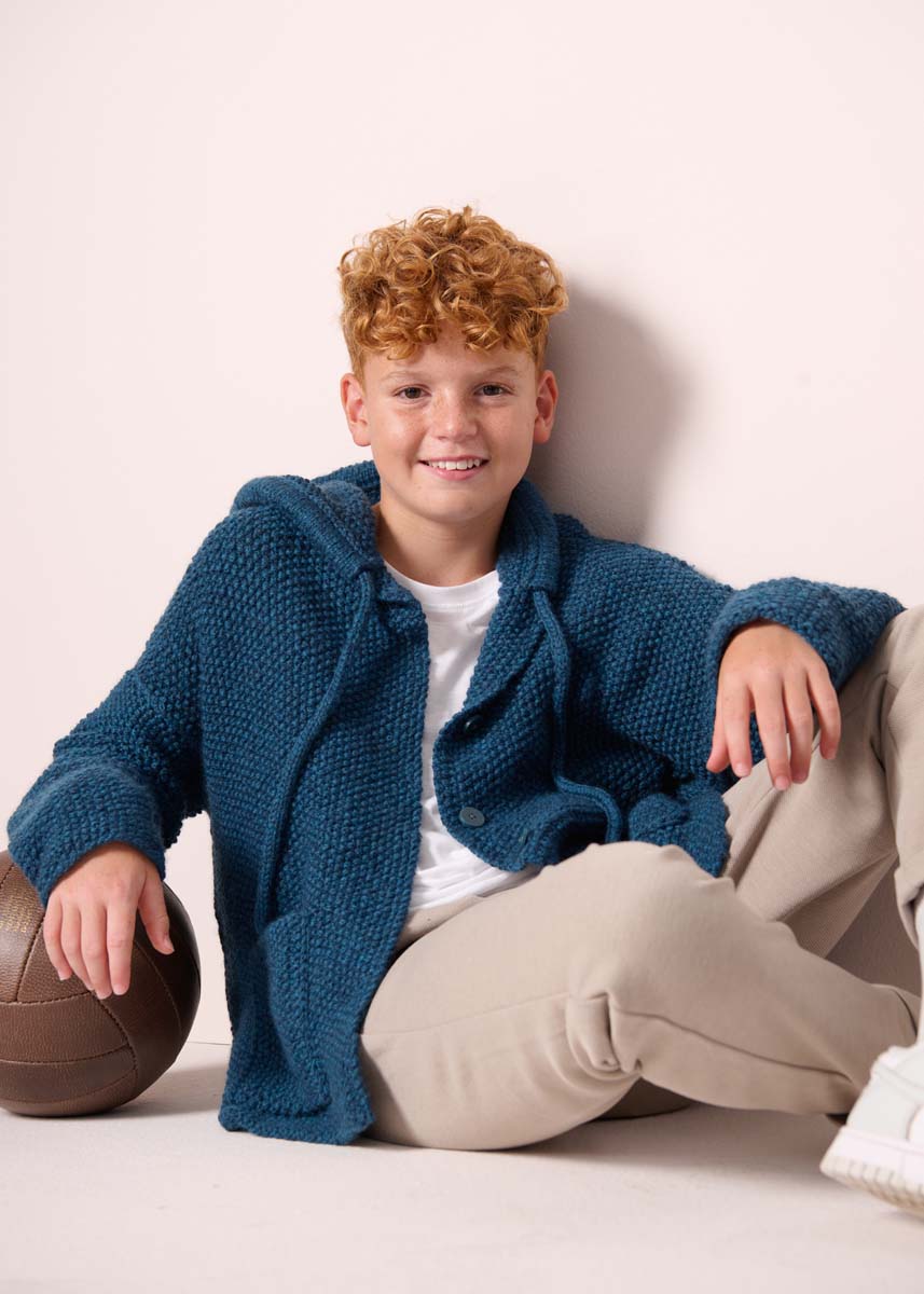 650 (700–700–750) г темно-петрольной (цв. 207) пряжи Cool Merino Big (90% шерсти мерино, 10% полиамида, 90 м/50 г) фирмы Lana Grossa; прямые спицы № 5, короткие круговые спицы № 5, 2 чулочные спицы № 4,5; 5 подходящих по цвету пуговиц диаметром 20 мм.