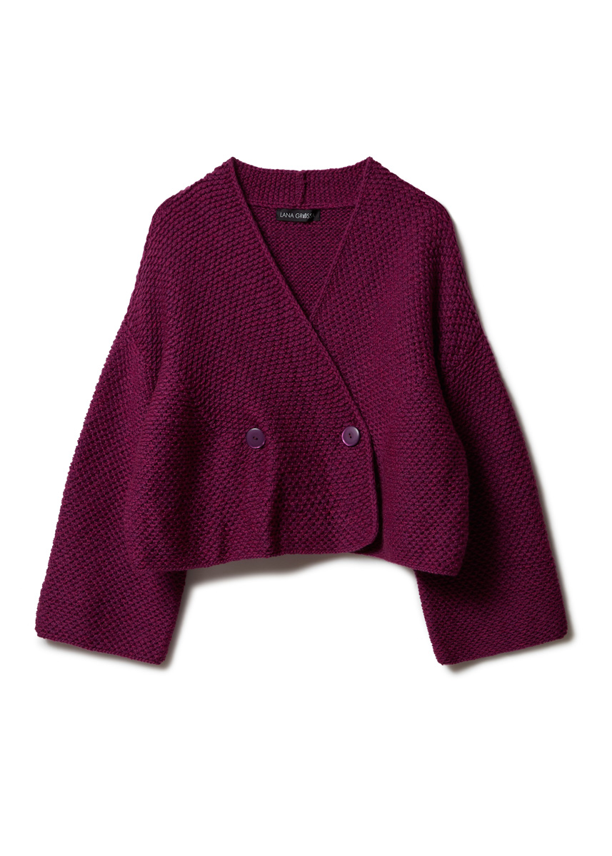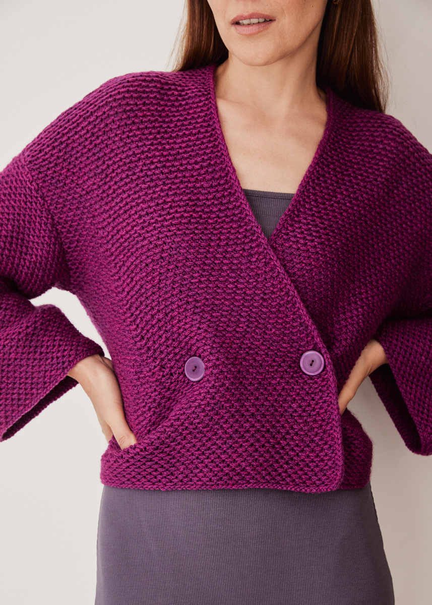 450 (500–550) г цвета фуксии (цв. 2) пряжи Cool Merino (90% шерсти мерино, 10% поли- амида, 150 м/50 г) фирмы Lana Grossa; прямые спицы № 5; 2 пуговицы цвета фуксии диаметром 28 мм