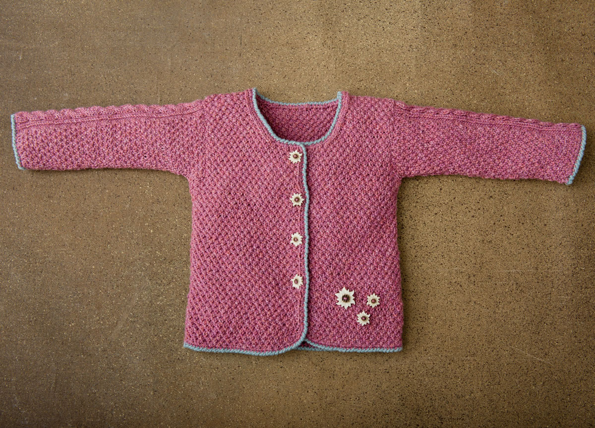200 (250) 250 г блекло-розовой меланжевой (цв. 330) и остаток мятной меланжевой (цв. 333) пряжи Cool Wool Big Melange (100% шерсти, 120 м/50 г) фирмы Lana Grossa; прямые спицы № 4,5; крючок № 4; шесть маленьких и одна большая пуговица цвета горечавки.