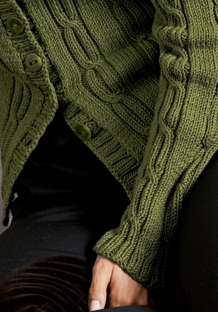 550 (600–650) г оливково-зеленой меланжевой (цвет 301) пряжи Cool Wool Big Melange фирмы Lana Grossa (100% шерсти мерино эксрафайн, устойчивой к сваливанию, 120 м/50 г); прямые спицы №3,5 и 4, круговые спицы №3,5 длиной 60 см; 7 пуговиц фирмы Union Knopf, арт. 451061, ⌀23 мм, цвет мха 26.