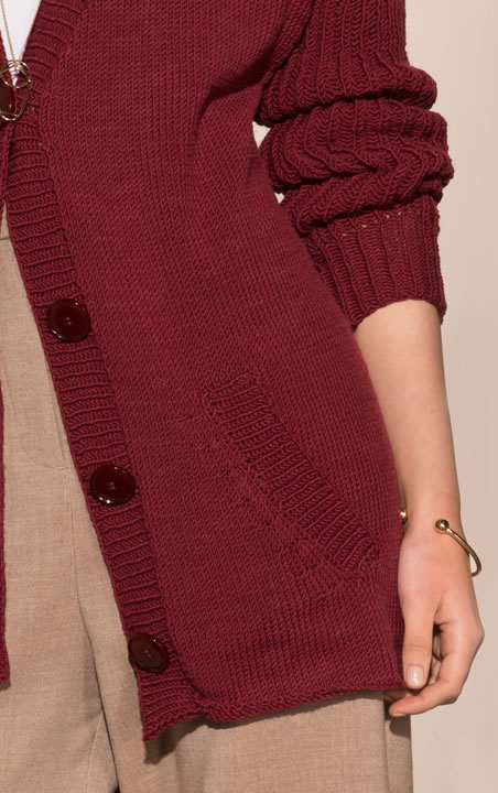 650 (700 – 750) г цвета бургунди (цвет 2026) пряжи Cool Wool фирмы Lana Grossa (100 % шерсти, 160 м/50 г), прямые спицы № 4 и 4,5, 4 пуговицы фирмы UNION KNOPF, арт. 450 188, цвет бургунди, размер 30 мм