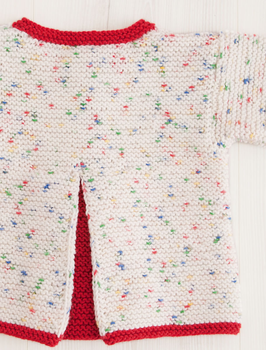 150 г бело-пестрой (цв. 801) пряжи Cool Wool Print Punto (100% шерсти, 120 м/50 г) и 50 г красной (цв. 23) пряжи Elastico (96% хлопка, 4% полиэстера, 160 м/50 г) фирмы Lana Grossa; прямые спицы № 4; 5 пуговиц