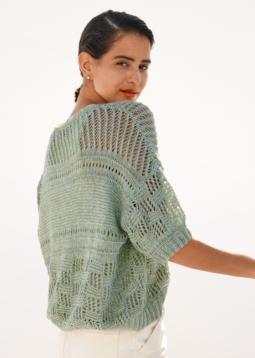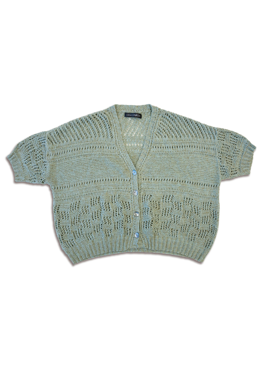 250 (300) г цвета мяты (цв. 9) пряжи Diversa (74% хлопка, 26% вискозы, 210 м/50 г) фирмы Lana Grossa; прямые спицы № 3 и № 4,5, круговые спицы № 3 длиной 120 см; 4 перламутровые пуго- вицы диаметром 18 мм