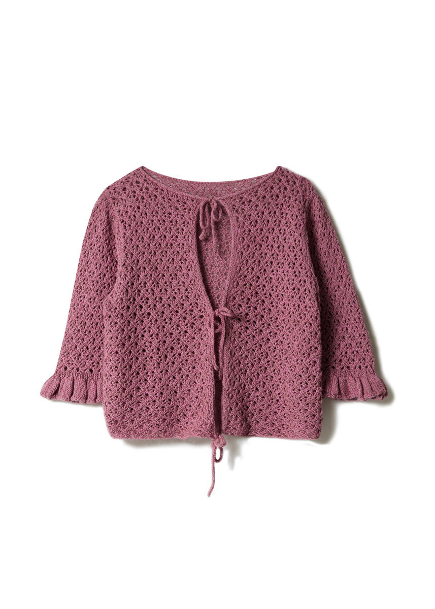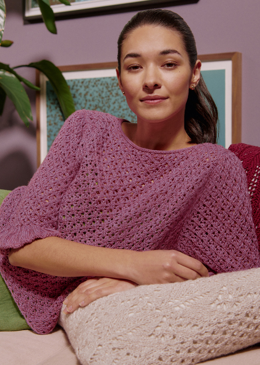 250 (300) г ягодной (цв. 3) пряжи Diversa (74% хлопка, 26% виско- зы, 210 м/50 г) фирмы Lana Grossa; прямые спицы № 4, круговые спицы № 4 длиной 80 см, чулочные спицы № 4.