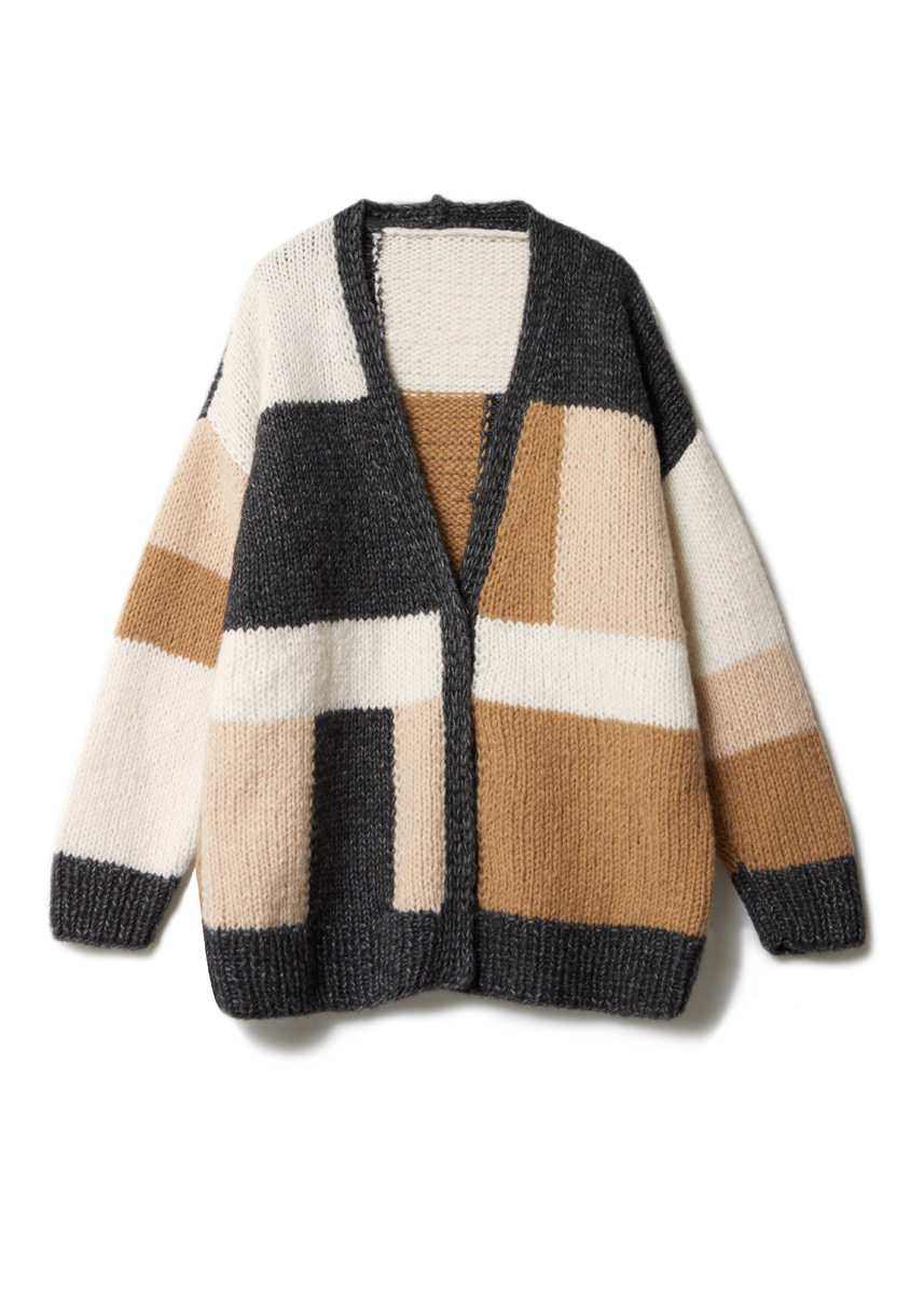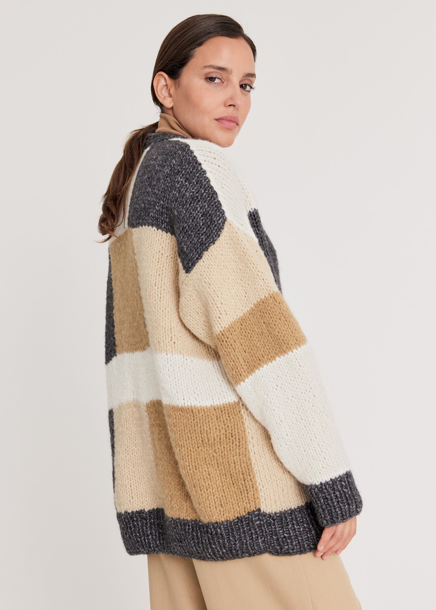 250 (300–300) г цвета антрацита (цв. 126), 200 (250–250) г белой суровой (цв. 111), 200 (200–250) г бежевой (цв. 130) и 150 (150–200) г цвета верблюжьей шерсти (цв. 129) пряжи Ecopuno Chunky (48% хлопка, 33% шерсти мерино, 19% альпака бэби, 70 м/50 г) фирмы Lana Grossa; прямые спицы № 7 и № 8; 4 пришиваемые кнопки диаметром 20 мм.