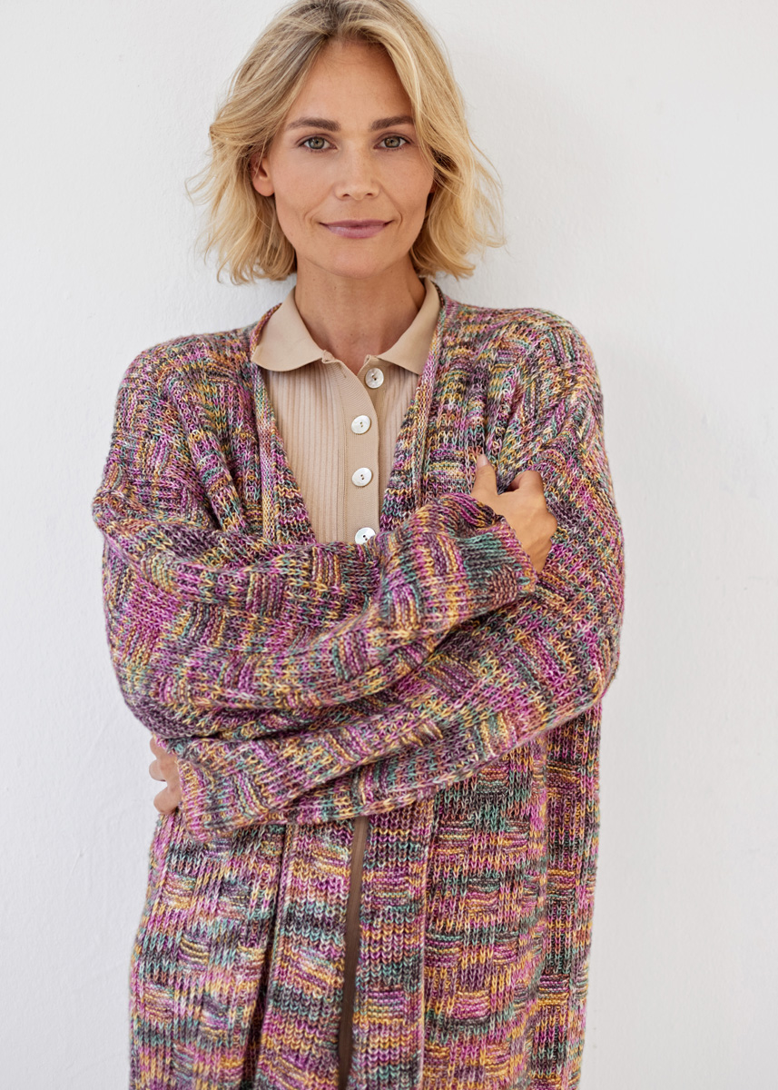650 (750) г цвета Suman (цв. 513) пряжи Ecopuno hand-dyed (72% хлопка, 17% овечьей (мериносовой) шерсти, 11% шерсти (ягненка) альпака, 215 м/50 г) фирмы Lana Grossa; прямые спицы № 3,5 и круговые спицы № 3,5 длиной 120 см