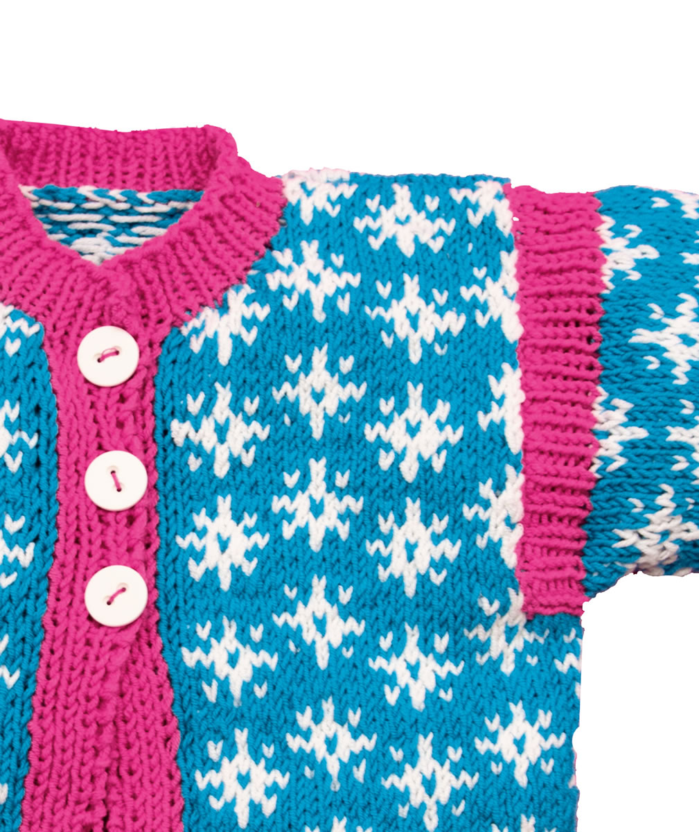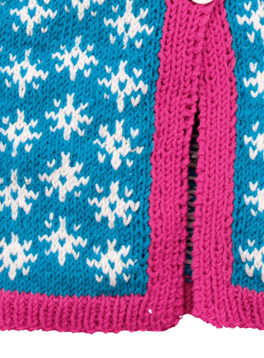 100 (100/150) г лазурно-голубой (цвет 115) и по 50 г белой (цвет 1) и розовой (цвет 100) пряжи Elastico фирмы Lana Grossa (96% хлопка, 4% полиэстера, 160 м/50 г); прямые спицы № 4, круговые спицы № 4 длиной 40 см; 3 пуговицы