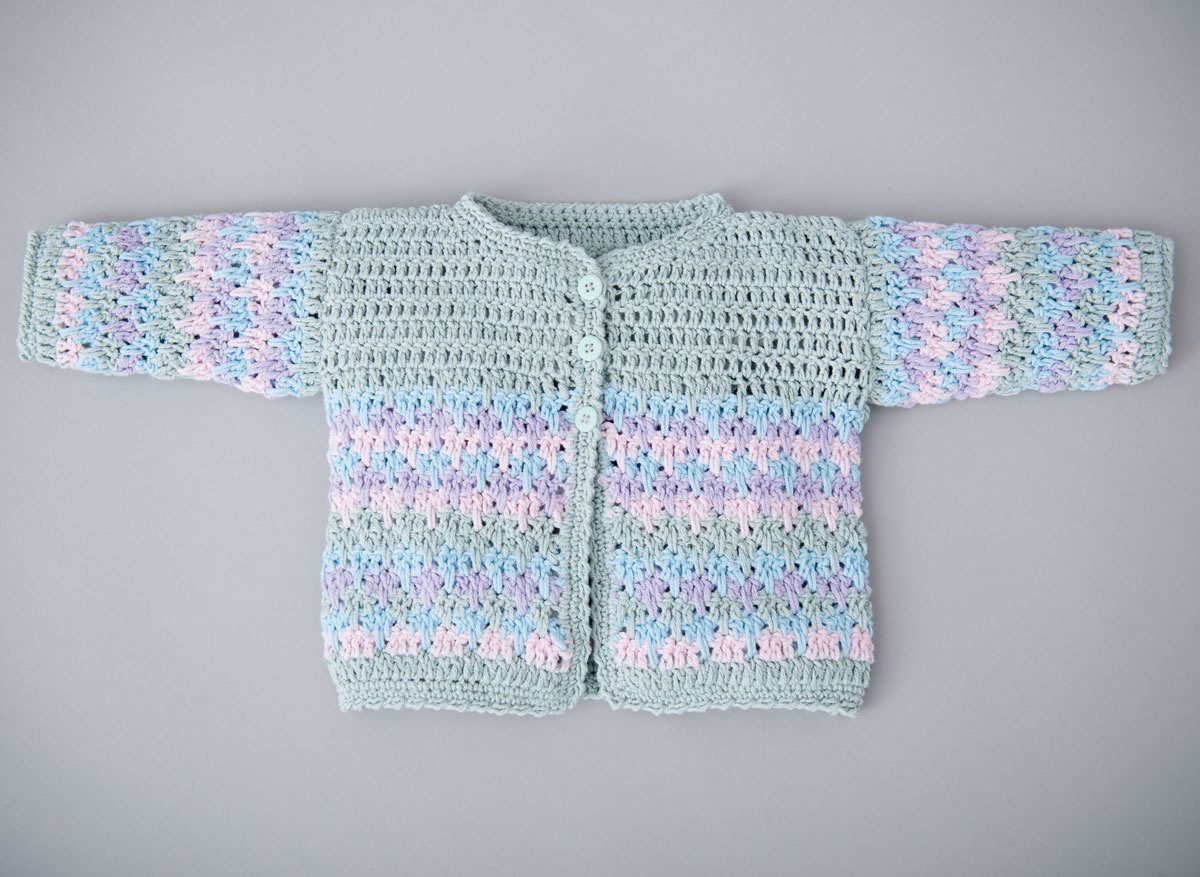по 50 г серо-зеленой (цв. 120), розовой (цв. 90), цвета лаванды (цв. 91) и светло-синей (цв. 92) пряжи Elastico (96% хлопка, 4% полиэстера (лайкры), 160 м/50 г) фирмы Lana Grossa; крючок № 4; три пуговицы.