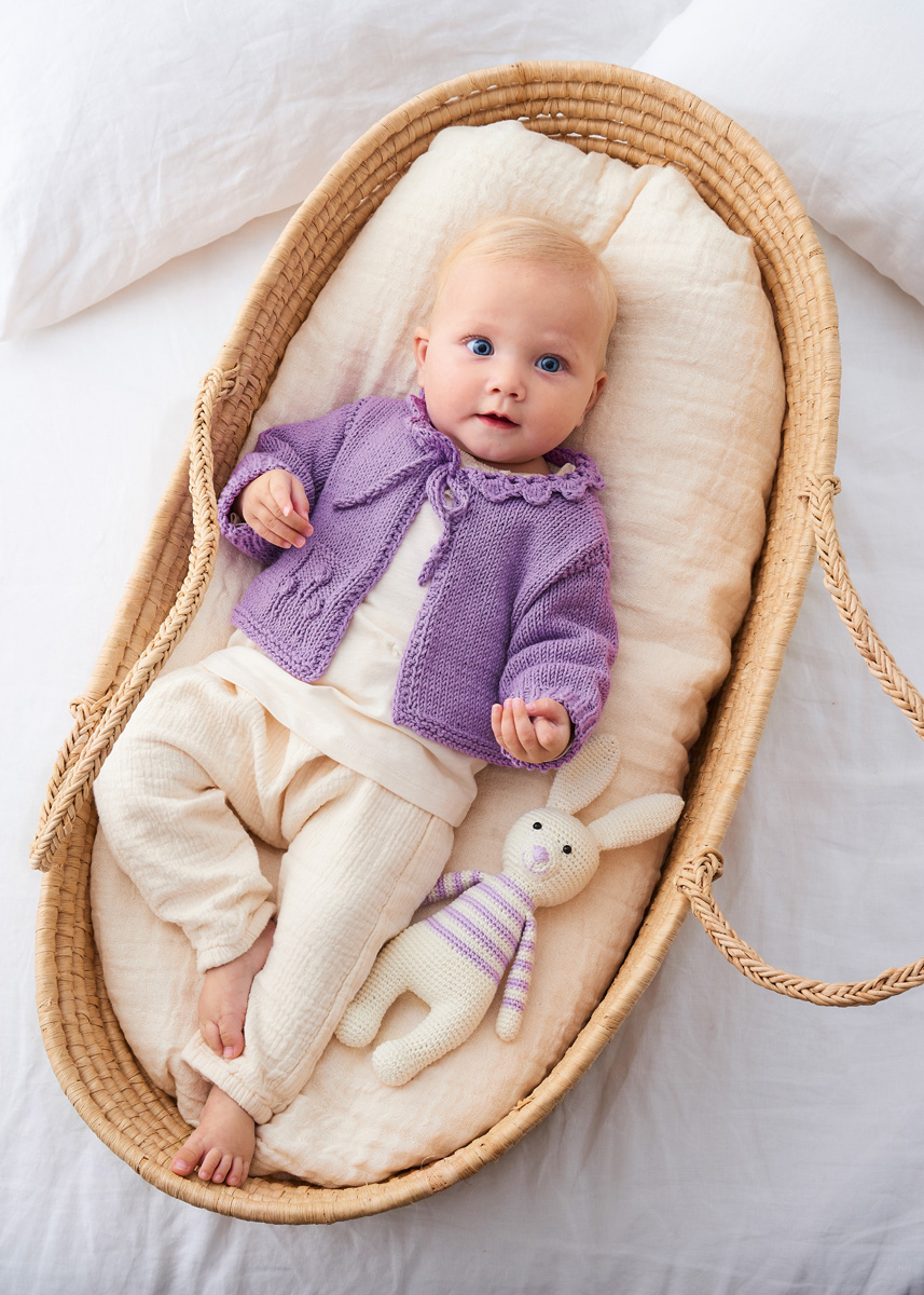 100 (150/150) г сиренево-лило- вой (цв. 164) пряжи Elastico (96% хлопка, 4% по- лиэстера, 160 м/50 г) фирмы Lana Grossa; прямые спицы № 4, крючок № 3,5