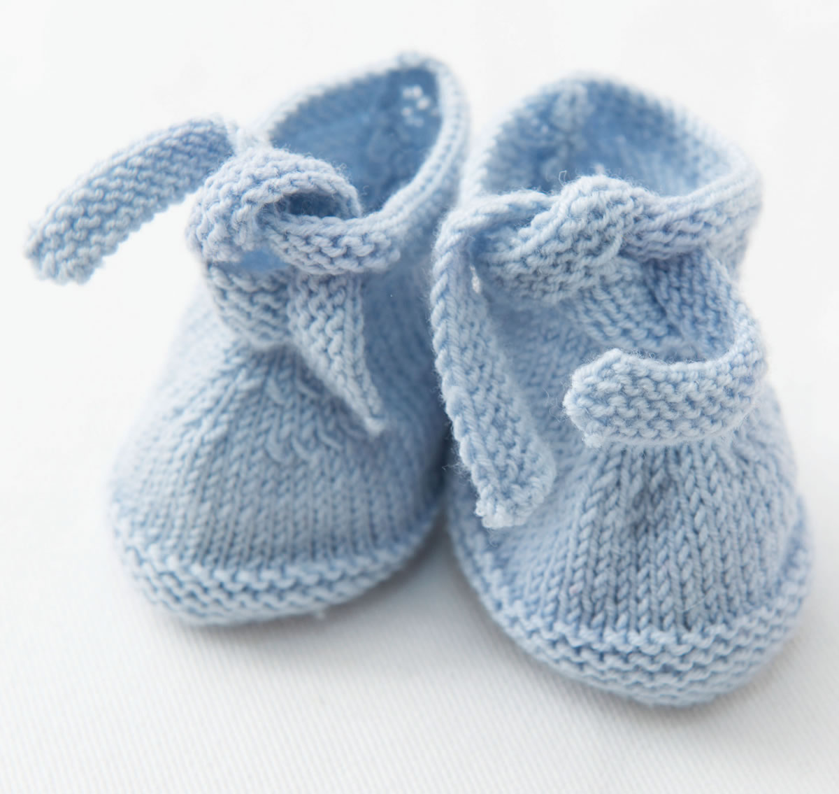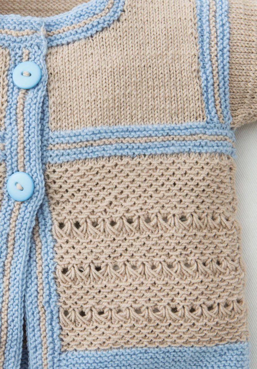 50 (50) 100 г цвета шелка-сырца (цв. 212) и 50 г светло-синей (цв. 208) пряжи Cool Wool Baby (100% шерсти, 220 м/50 г) фирмы Lana Grossa; прямые спицы № 3; круговые спицы № 3 длиной 40 см; две пуговицы.