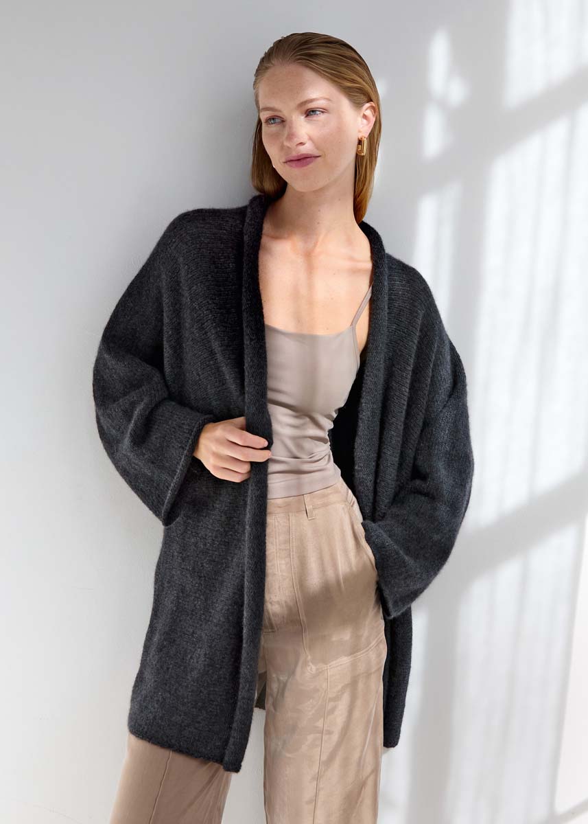 400 (450–475–525) г ц вета ан- трацита (цв. 107) пряжи Cashmere Kiss (70% шерсти мерино суперфайн, 30% кашемира, 70 м/25 г) фирмы Lana Grossa; круговые спицы № 4,5 длиной 100 см