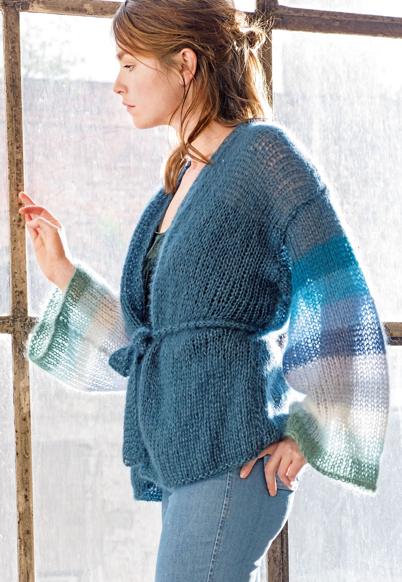 150 (150) 175 г темно-бензиновой (цвет 66), 25 г бензиновой (цвет 23), 25 г бирюзово-голубой (цвет 68), 25 г васильковой (цвет 40), 25 г темно-синей (цвет 79), 25 г небесно-голубой (цвет 92), 25 г светло-голубой (цвет 42), 25 г серебристо-серой (цвет 41), 25 г светло-бирюзовой (цвет 82) и 25 г темно-зеленой (цвет 89) пряжи “Silkhair“ (70 % мохера суперкид, 30 % шелка, 210 м/25 г) фирмы Lana Grossa. Спицы № 8 и 10; 2 вспомогательные спицы (= для отложенных петель).