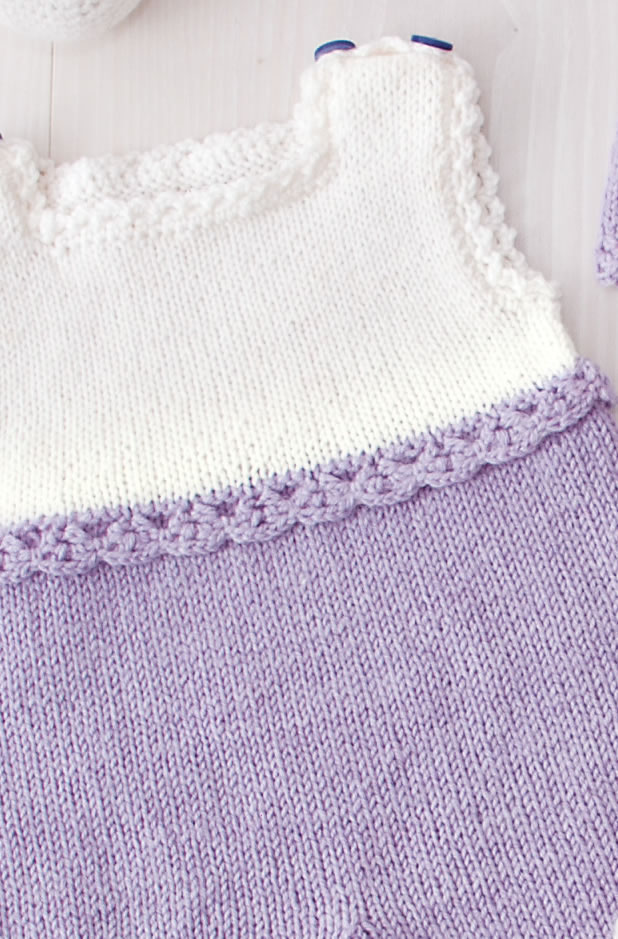 100 г лиловой (цв. 215) и 50 г белой (цв. 207) пряжи Cool Wool Baby (100% мягкой мериносовой шерсти, 220 м/50 г) фирмы Lana Grossa; прямые спицы № 3; круг. спицы № 3 длиной 40 см; крючок № 2,5; 5 пуговиц.