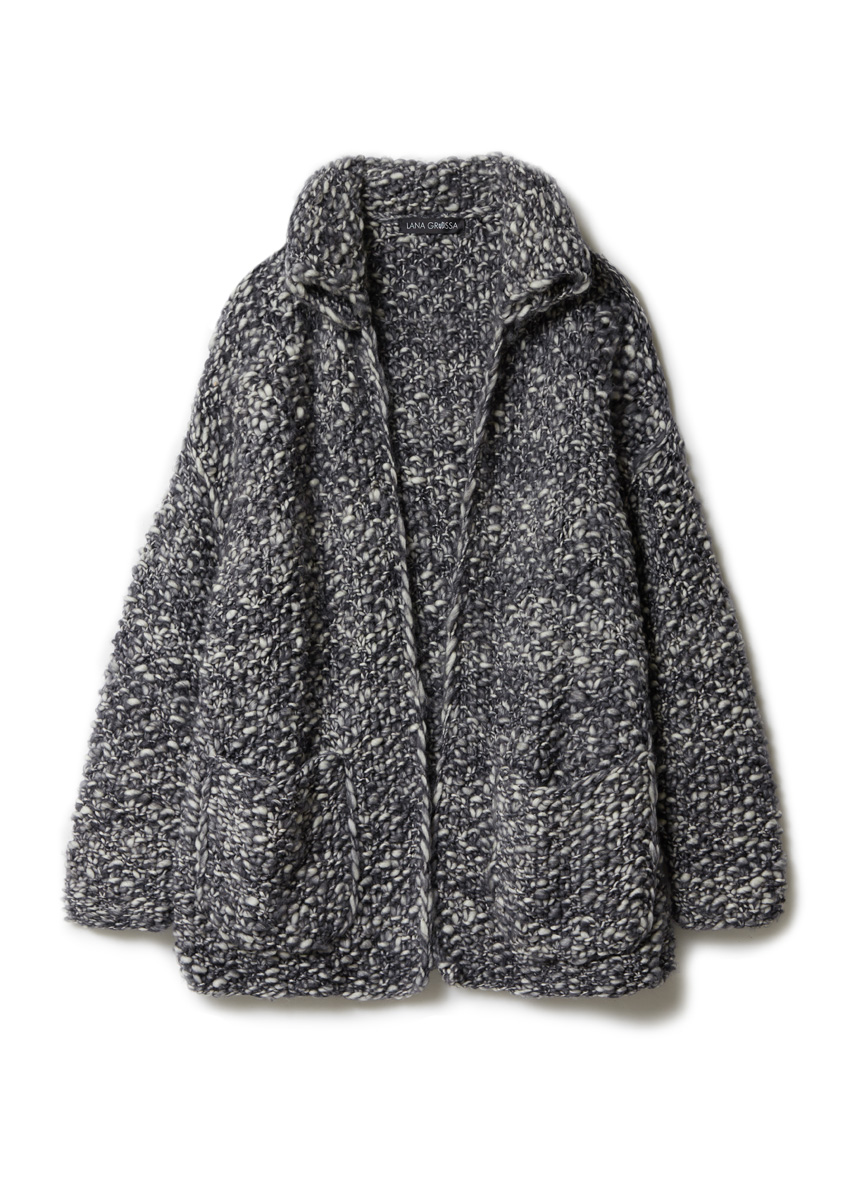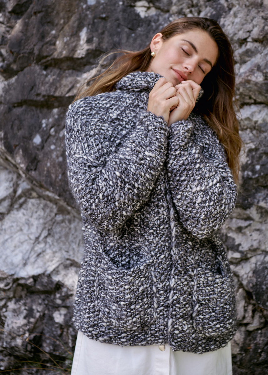 1000 (1100–1200) г темно-серой/белой суровой меланжевой (цв. 102) пряжи Lala Berlin Flamy (100% шерсти мерино, 70 м/100 г) фирмы Lana Grossa; прямые спицы № 12, круговые спицы № 12 длиной 50 см