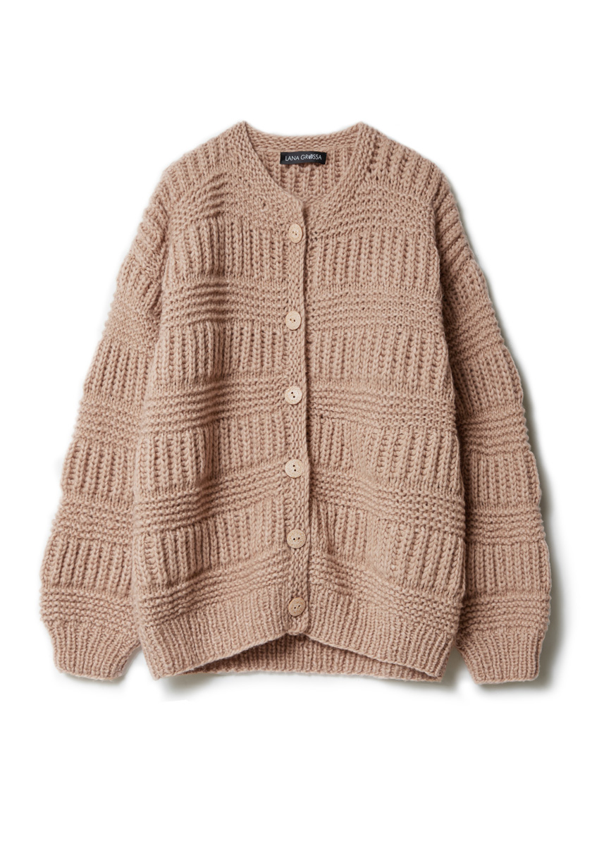 Lala Berlin Lovely Cotton (75% шерсти мерино суперфайн, 25% хлопка, 90 м/50 г) фирмы Lana Grossa; пря- мые спицы № 5, № 6,5 и № 8, круговые спи- цы № 7 длиной 50 см; 6 бежевых пуговиц диаметром 25 мм.