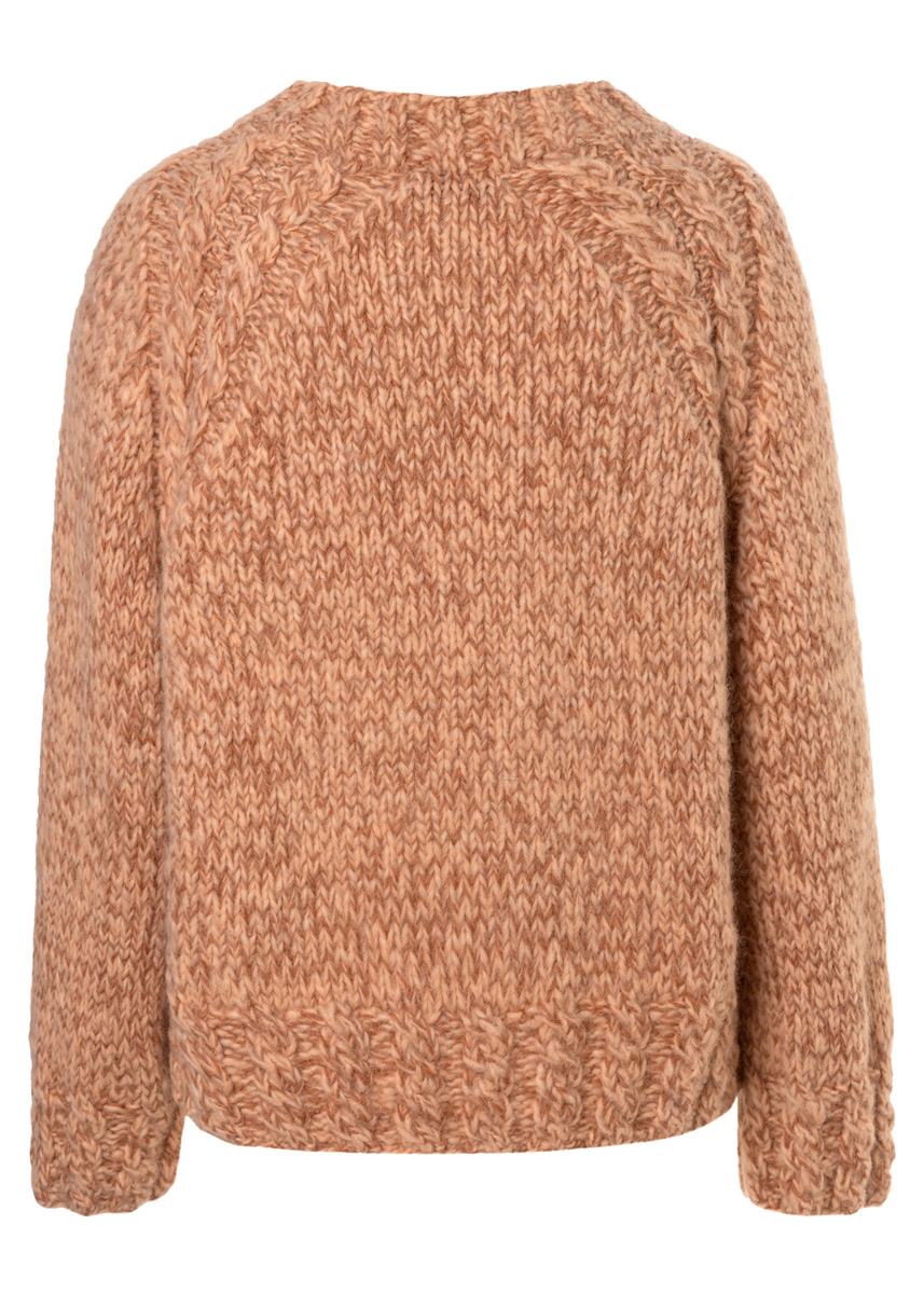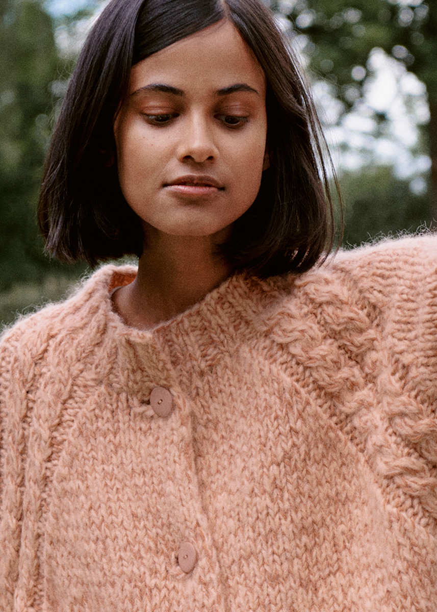 250 (300) г светло-ко- ричневой (цв. 426) пряжи Landlust Alpaka Merino 160 (50% шерсти мерино, 50% альпака бэби, 160 м/50 г) и 300 (350) г желто-розовой (цв. 22) пряжи Alpaca Moda (74% альпака бэби, 13% шерсти мерино, 13% полиамида, 135 м/50 г) фирмы Lana Grossa; прямые спицы № 8, круговые спицы № 8 длиной 50 см, 1 вспомогательная спица для кос; 3 светло-коричневые пуговицы ди- аметром 25 мм.