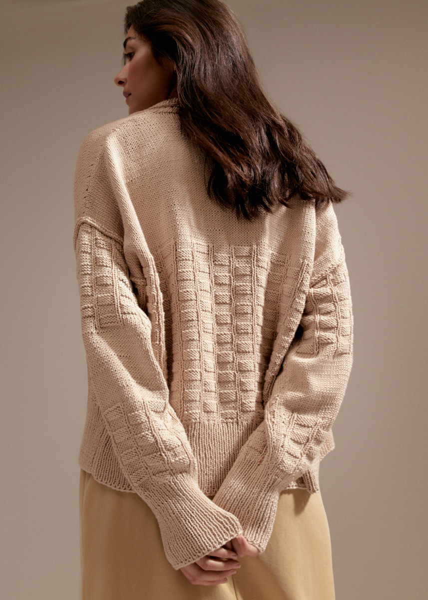 600 (650–700) г бежевой (цв. 15) пря- жи Landlust Baumwolle (100% хлопка органического (эко), 115 м/50 г) фирмы Lana Grossa; прямые спицы № 3 и № 4, 2 пары круговых спиц № 3 длиной 60 см; 2 пришиваемые кнопки диаметром 26 мм.