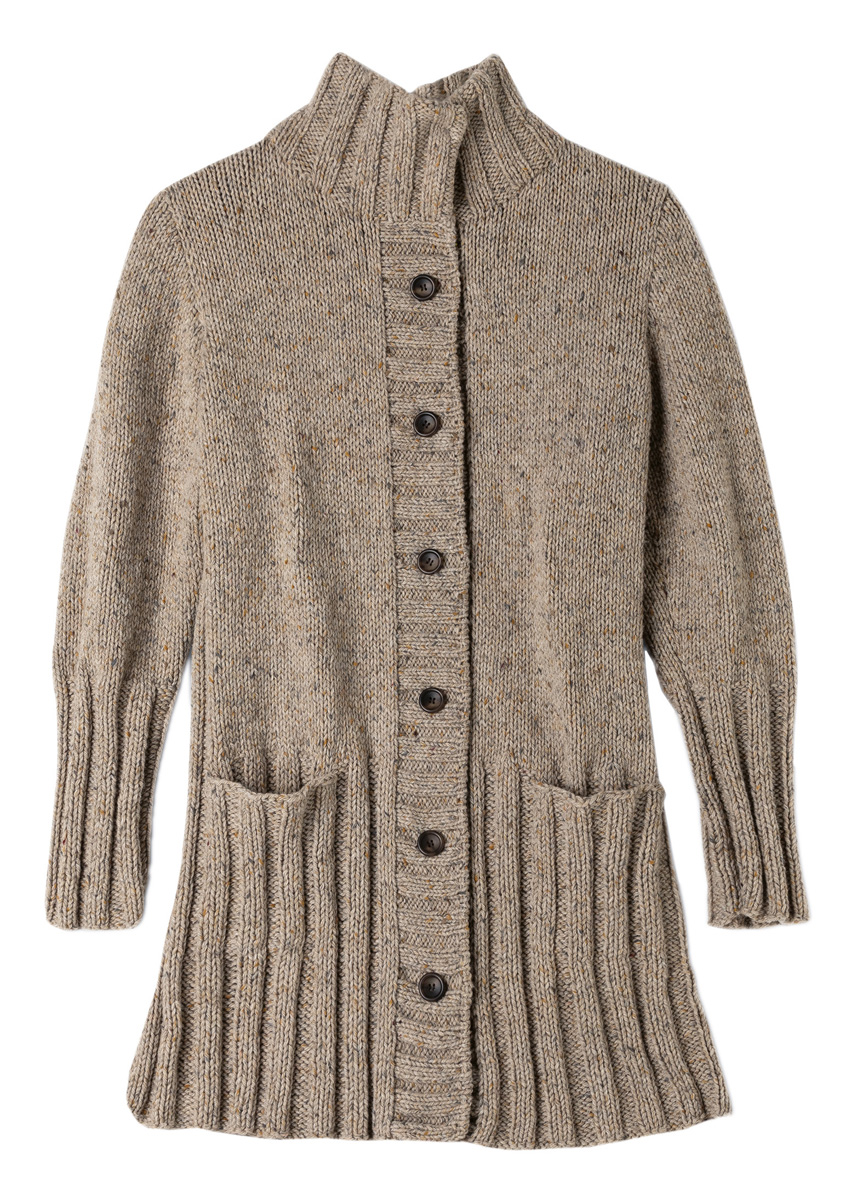 800 (900–1000) г бежевой меланже- вой (цв. 2) пряжи Landlust Soft Tweed 90 (100% шерсти, 90 м/50 г) фирмы Lana Grossa; прямые спицы № 5, круговые спицы № 5 длиной 60 см, игла с тупым концом; 6 коричневых пуговиц диаметром 22 мм