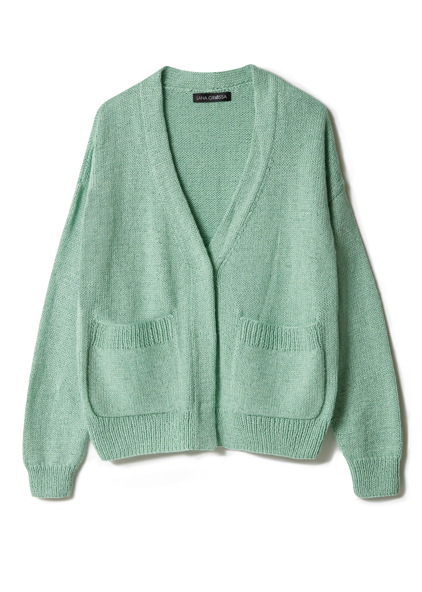 600 (650–700) г светло-зеленой (цв. 301) пряжи Linarte (40% вискозы, 30% хлопка, 20% льна, 10% полиамида, 125 м/50 г) фирмы Lana Grossa; прямые спицы № 2,5 и № 4; 3 пришиваемые белые пластмассовые кнопки диаметром 20 мм