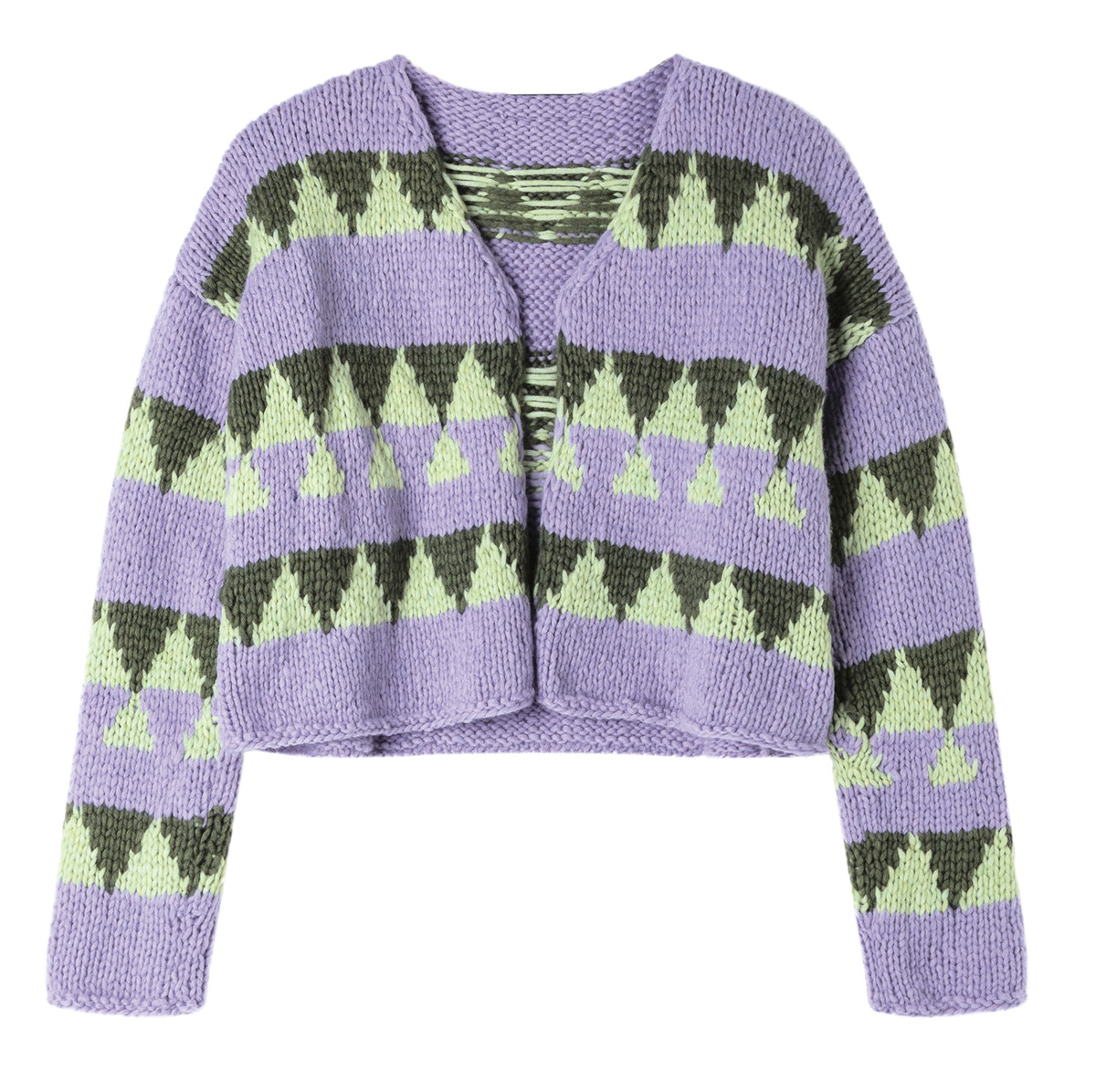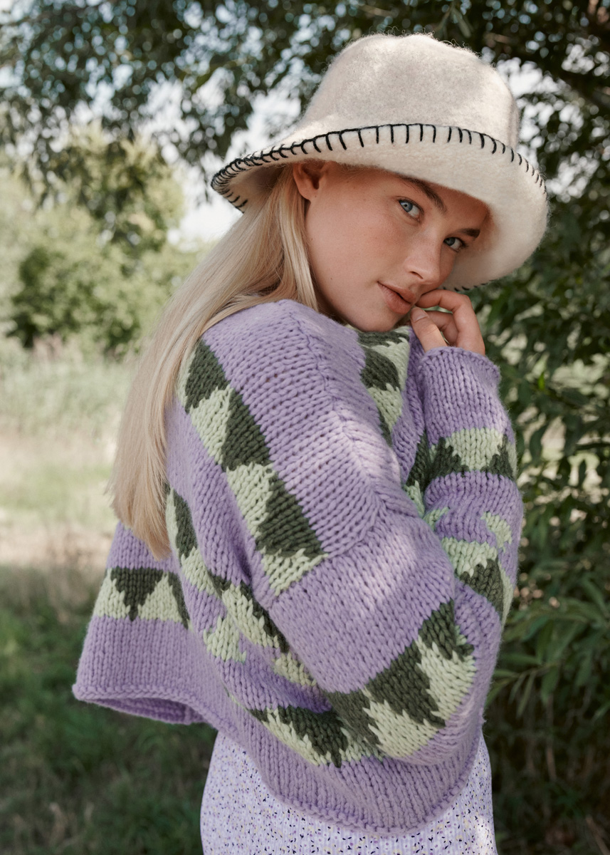 250 (300–400) г сиреневой (цв. 29), 100 (150–150) г бело-зеленой (цв. 22) и 100 (150– 150) г мшисто-зеленой (цв. 23) пряжи Lala Berlin Lovely Cotton (75% шерсти мерино экстрафайн, 25% хлопка, 90 м/50 г) фирмы Lana Grossa; прямые спицы № 9 и крючок № 6.