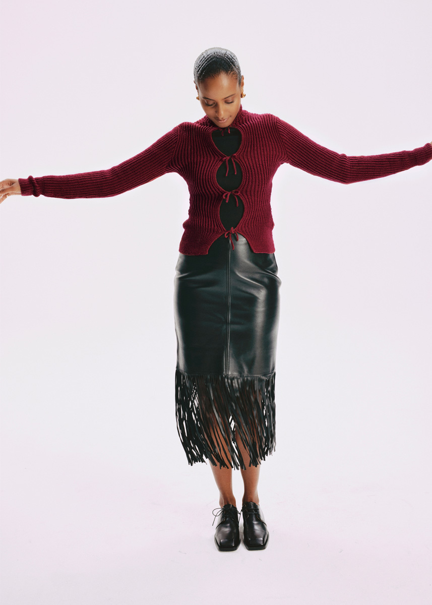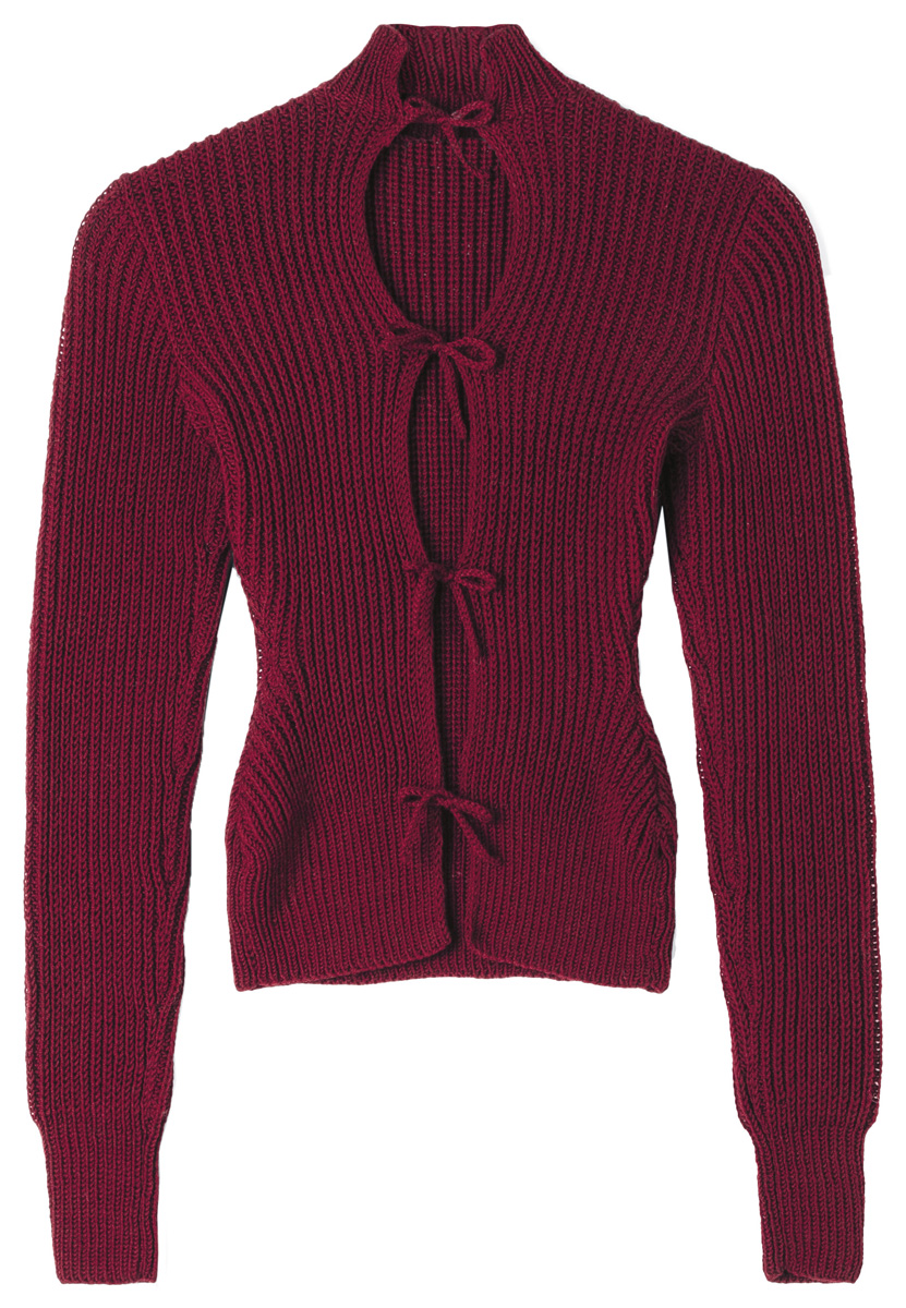 350 (400–450) г темно-красной (цв. 28) пряжи Merino Superiore (100% шерсти мерино экс- трафайн, 180 м/50 г) фирмы Lana Grossa; прямые спицы № 3,5 и крючок № 3.