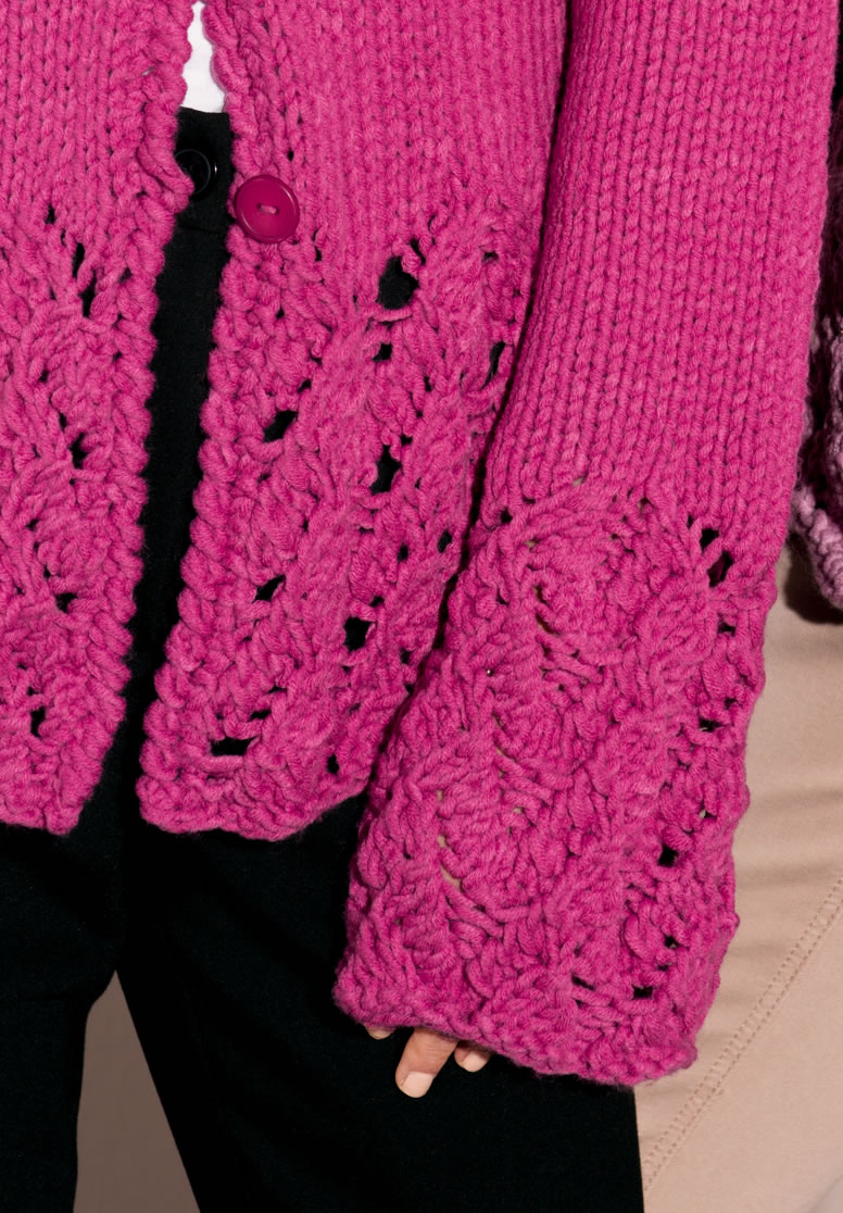 600 (650/700) г цвета фуксии (цвет 84) пряжи Mille II фирмы Lana Grossa (50 % шерсти, 50 % полиакрила, 55 м/50 г), прямые спицы № 7, вязальный крючок № 6, 5 пуговиц фирмы Union Knopf (арт. 415978) Ø 22 мм