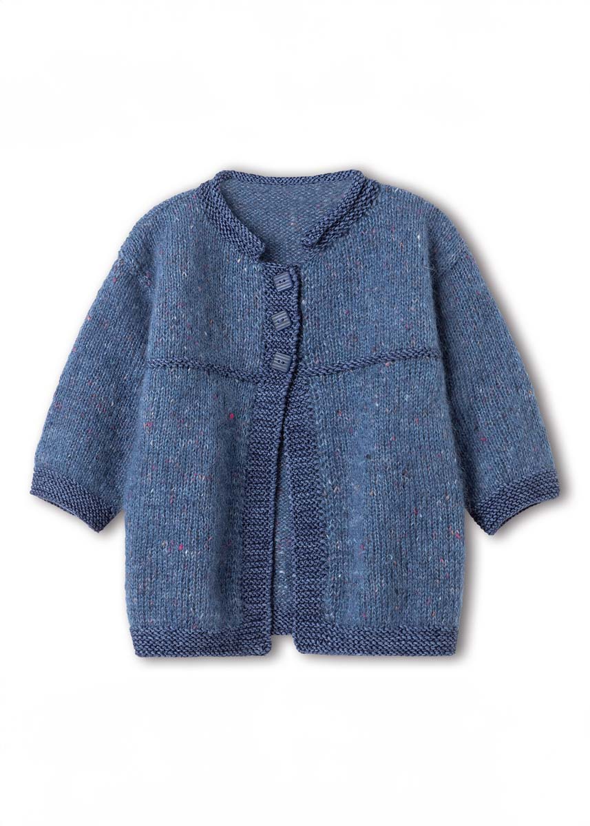 100 (100/125/150) г темно-синей (цв. 619) пряжи Natural Superkid Tweed (60% мохе- ра суперкид, 30% шелка, 7% хлопка, 3% полиэстера, 200 м/25 г) и 50 (50/50/50) г темно-синей (цв. 7166) пряжи Cool Wool Big Vintage (100% шерсти мерино экстрафайн, 120 м/50 г) фирмы Lana Grossa; круговые спицы № 3,5 и № 4; 3 пуговицы диаметром 15 мм
