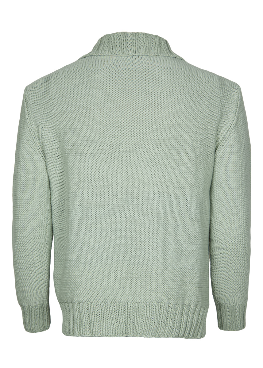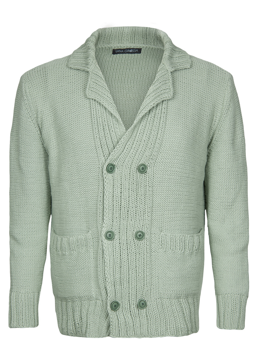 750 (800–850) г серо-зеленой (цв. 89) пряжи Organico (100% био-хлопка, 90 м/50 г) фирмы Lana Grossa; прямые спицы № 4, круг. спицы № 4 длиной 40 см, 6 серо-зеленых пуговиц диаметром 23 мм